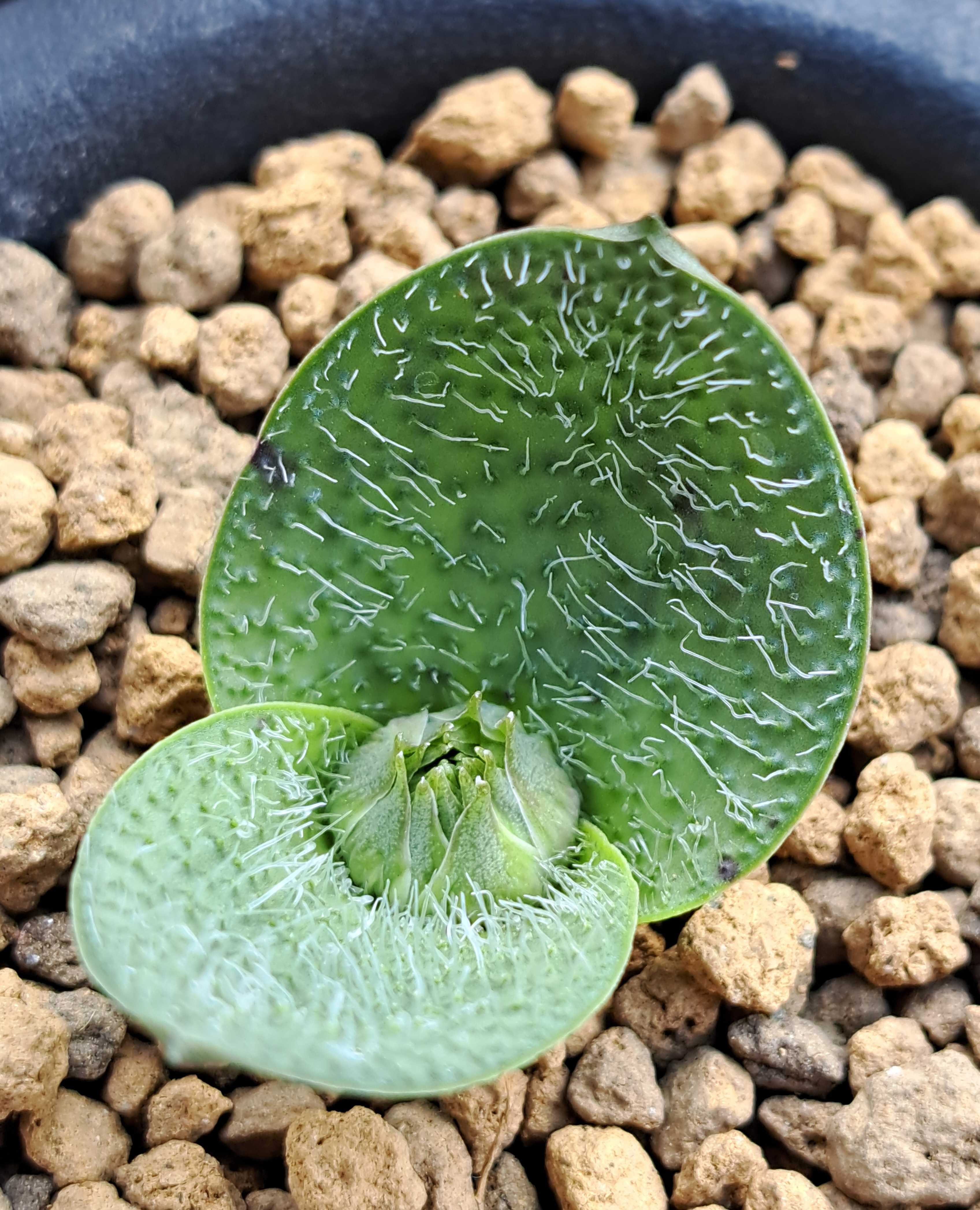 冬型の目覚めといってもその時期はまちまちで亀甲竜なんかは9月アタマにはもうツルを出し始動していた。フィロボルス・ラビエイはもっと早く8月中旬に動き出し現在はこのように。枯れ葉が見苦しいが新葉はここまで茂ってきた。今後さらにワサワサになるのだ。透明の吸盤みたいなのがびっしり張り付いた葉は珍しい。色もパステルでなかなか可愛い。亀甲竜、フィロボルス、これに続いて動き出したヤツはおらんか?いた!コイツ。マッソニア・ピグマエア。タケノコみたいに地上に現れとるやないか。いやあ久しぶり。4ヶ月ぶりぐらいかね?でも春頃にはもうヘロヘロだったからシャキッとした姿を見るのは半年ぶりだね。外側に1枚、内側に1枚葉がある。葉には毛が生えていてすでにそれが確認できる。これがむくむく大きくなって開くのだ。2枚葉となりそのままシーズン終わりまで増えることなく過ごす。面白いヤツだわ全く。ピグマエアはもうひと鉢あるのだがそっちはまだ動き出さない。ロンギペス3鉢もまだだ。10月中旬ぐらいぐらいから徐々に出てくる感じだろうな。ウンビリクス玉杯。ゴミのようになった枯れ地上部の真ん中あたり。わずかにミドリが見える。動き出したんじゃないの?去年も10月10日ごろの始動だったし、そろそろ動き出してもおかしくない。拡大。こ…これは…。芽じゃないね。カビかコケか藻か…そんな感じ?紛らわしいな~。コイツはどや?モニラリア・モニリフォルメ。おっ。こりゃ間違いない。ミドリの丸いヤツが出てきつつある。成長開始だ。コノフィツムの脱皮みたいに皮をやぶって出てくるのだね。面白い。徐々に動き出す冬型。でも品種によって時期が全然違うんだよね。亀甲竜やフィロボルスはまだくっそ暑い時に動き始めるしダドレアみたいに晩秋ごろ動き出すヤツもいる。何が引き金になってるんだろうね。不思議…。(多肉植物)マッソニア プスツラータ 3〜4号(1ポット)Massonia tenella マッソニア テネラ JAA1780【希少】モニラリア 6cmポット チョキのようなかわいいフォルム多肉植物 caモニラリア クリソレウカ 多肉植物 コーデックス 6cmポット