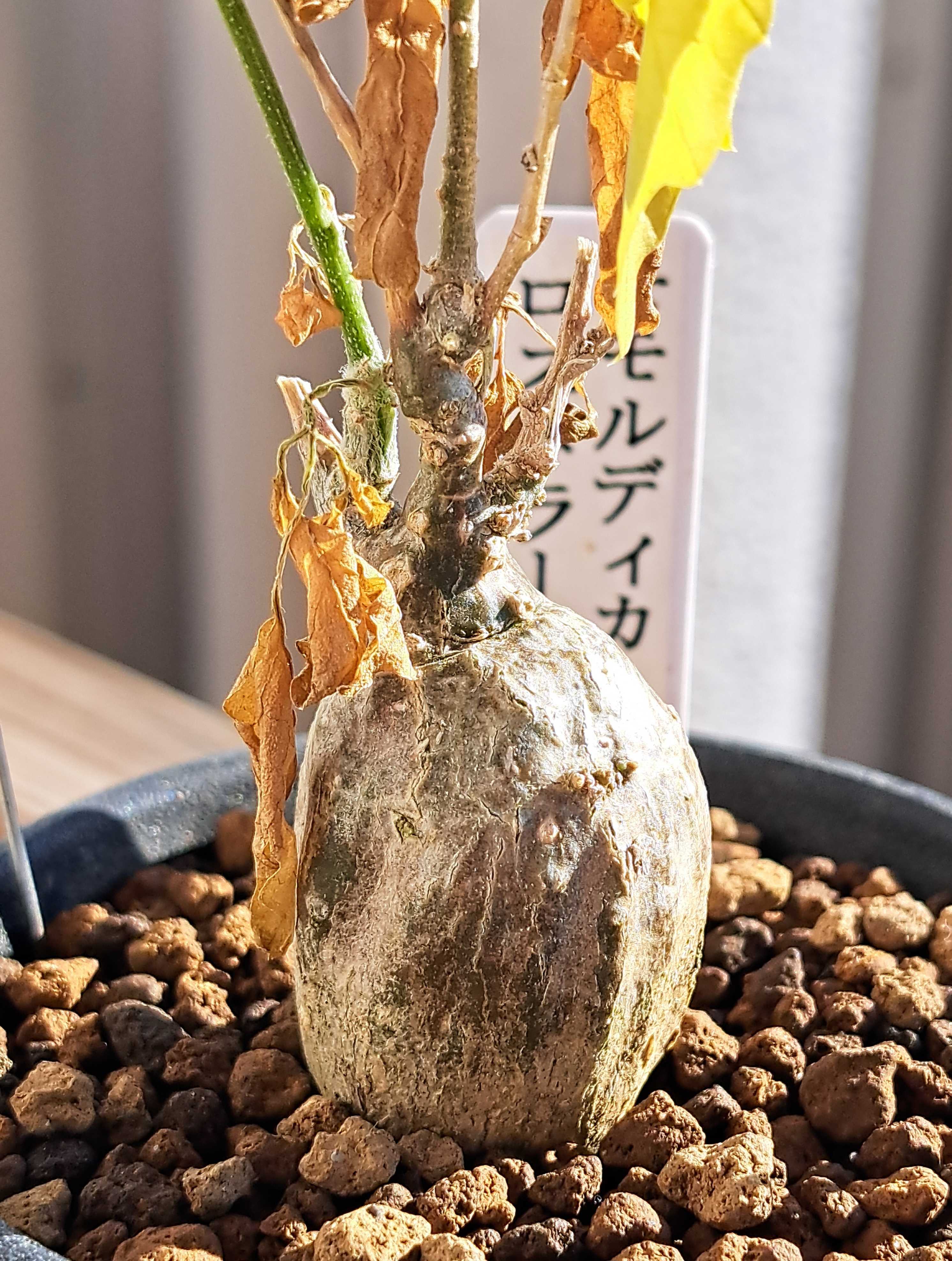 フィランサス・ミラビリスを記事にしたのは7月26日。あれから約2ヶ月。どうなっているだろうか?真夏のくそ暑い中成長したのか?それとも暑い時期には成長しないのか?さっそく見てみよう。前回登場時のミラビリス1号。現在。イマイチ分かりづらいが葉が増えている。くそ暑い時期でも成長したわけだ。2号も見てみよう。前回登場時。現在。コイツも葉が増えている。今年出た右側の枝もかなり成長している。これが前回の新枝。現在。4枚だったのが8枚に増えたね。やはりくそ暑くても動くんだ。そういえば…。前回出そうだった1号新枝。どうなっただろうか?現在。う~ん。出てないね。出そうなところは複数あるんだが…出ない。今年は無理か。来年に期待だ。塊根はどうかな?あまり変わってないようだね。ま、こんなもんだろう。コーデックスの塊根ってなかなか肥大しないもんね。数年かかってやっとわかるぐらい。コイツも3年後にはちょっと太ったなと実感できるぐらいになるんじゃないか。2号も見よう。コイツの場合茎が残っていて、ぐにゃりと曲がっているところが面白い。塊根…人はなぜ塊根に惹かれるのだろう?不思議だ…。観葉植物/フィランサス:ミラビリス(Mサイズ) 2.5号鉢植え観葉植物/フィランサス:ミラビリス 3.5号鉢植え観葉植物/フィランサス:ミラビリス 3号鉢植えチロセマ・ファッソグレンシス 7.5cm鉢 カクタス長田 マメ科 蝶型葉 多肉植物 コーデックス 塊根植物 珍奇植物 サキュレントプランツフィカス・ペティオラリス 9cm鉢 カクタス長田 クワ科 多肉植物 コーデックス 塊根植物 サボテン 珍奇植物 サキュレントプランツ