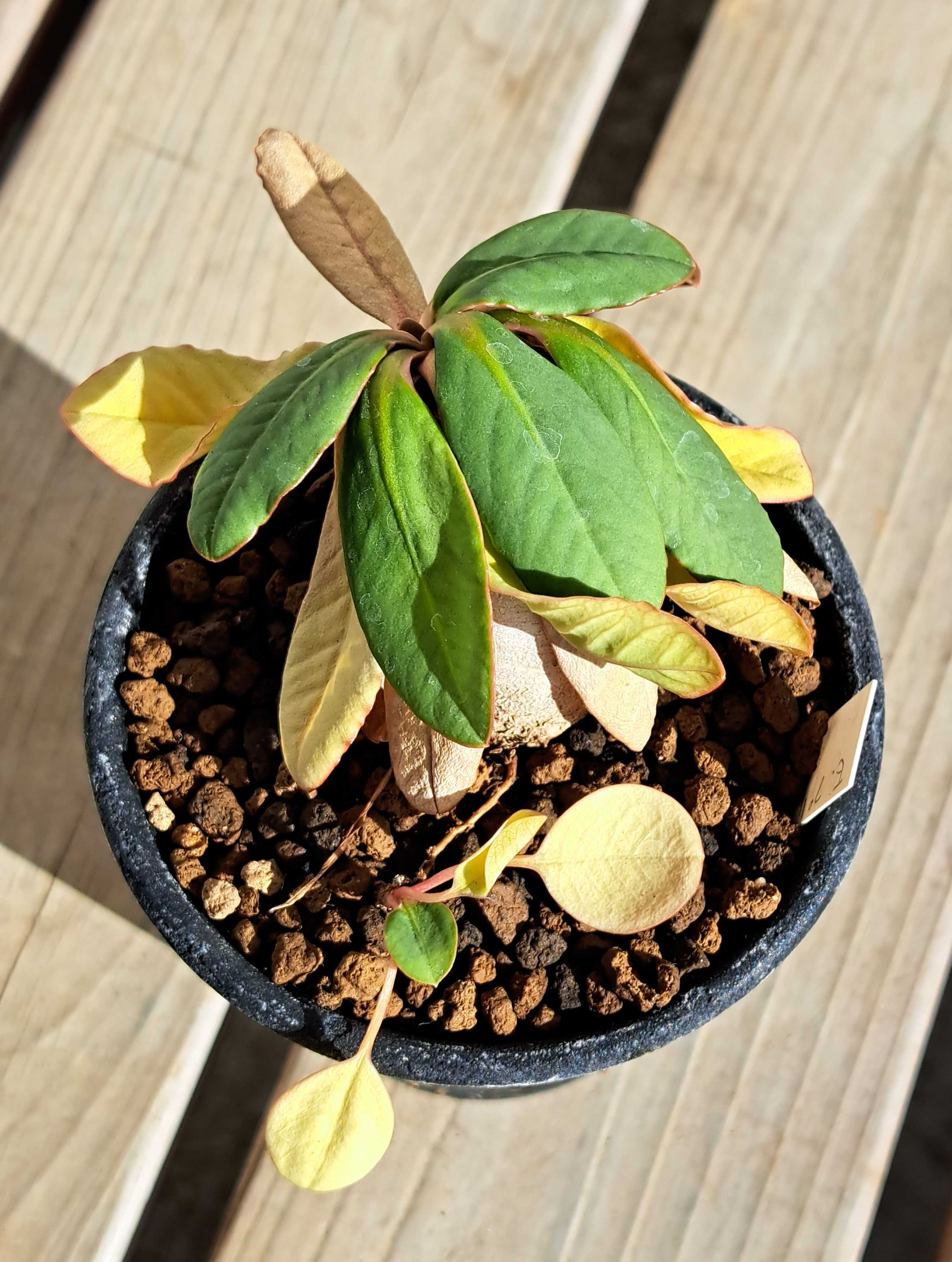最低気温が10℃を下回り朝晩は暖房をつける日も出てきた今日この頃。うちの植物にも葉を枯らすヤツらが出てきた。ユーフォルビア・プリムリフォリア。ほんの数日前までミドリミドリしていたのだが急激に下葉が枯れてきた。早くもミドリは上3分の1程度に。右側の仔も枯れている。ユーフォルビア・ブレビフォリア。紅葉が進んできた。ミドリは30%程度。いずれ枯れ落ちる。枝は多少伸びただろうか?丈夫なユーフォだが成長はかなり遅い。ユーフォルビア・ゴルゴニス。コイツの場合葉ではなく枝が枯れてきた。左側2本はすでに干からびている。フラナガニーもそうだがタコものは下から枝が枯れてくるようだ。一方上からは新枝。こうやって生え変わるのだろうね。そういや飛竜や奇怪ヶ島も同じだ。鉄甲丸。コイツは夏ぐらいから葉の枯れが目立っていた。水をやるとなかなかしみこまず水はけが悪い。根詰まりだ。抜いたところやはり根詰まりで根はぐるぐるのパンパンだった。根を半分ぐらい切り植え込み。翌日水やりした。寒さにはかなり強い鉄甲丸。植え替えたので再び成長するはず。しばらくすれば再び葉も繁るだろう。フォッケア・マルチフローラ。少し前から葉が黄変し始めたので室内に取り込んだが、それでも黄変は進んでいる。一年目なので性質がよく分からない。念のため引き続き室内に置く。だが同じフォッケアでも火星人はまだミドリ。マルチフローラとは性質が異なるのか?コイツは外置きなのだが…。アデニア・グラウカ。コイツも下葉が枯れてきた。一番下は落ちる寸前。下から順に枯れていくらしい。しかし別のグラウカはというと、まだミドリ。確か去年は葉をつけたまま越冬したが…。今年はどうだろう。フォッケア・マルチフローラとアデニア・グラウカは室内置き、他は全て外置き。水は2週に1回たっぷりだがそろそろ量を減らしてもいいかもしれないね。多肉植物 halkユーフォルビア ゴルゴニス 実生 多肉植物 HALKA SUCCULENT ハルカさん苗 ユーフォルビア コーデックス 6cmポット多肉植物:ユーフォルビア 鉄甲丸*S 塊根幅2cm ☆赤松実生多肉植物 caユーフォルビア 鉄甲丸 9cmポット 多肉植物 ユーフォルビア★【現品・現物】Fockea multiflora(フォッケア・ムルチフローラ)(フォッケア・マルチフローラ)8号 おA番フォッケア・エデュリス 火星人 9cm鉢 カクタス長田 ガガイモ科 多肉植物 コーデックス 塊根植物 サボテン 珍奇植物 サキュレントプランツ☆特価☆多肉植物:アデニア グラウカ*S 塊幅1.8cm ☆赤松実生グラウカ