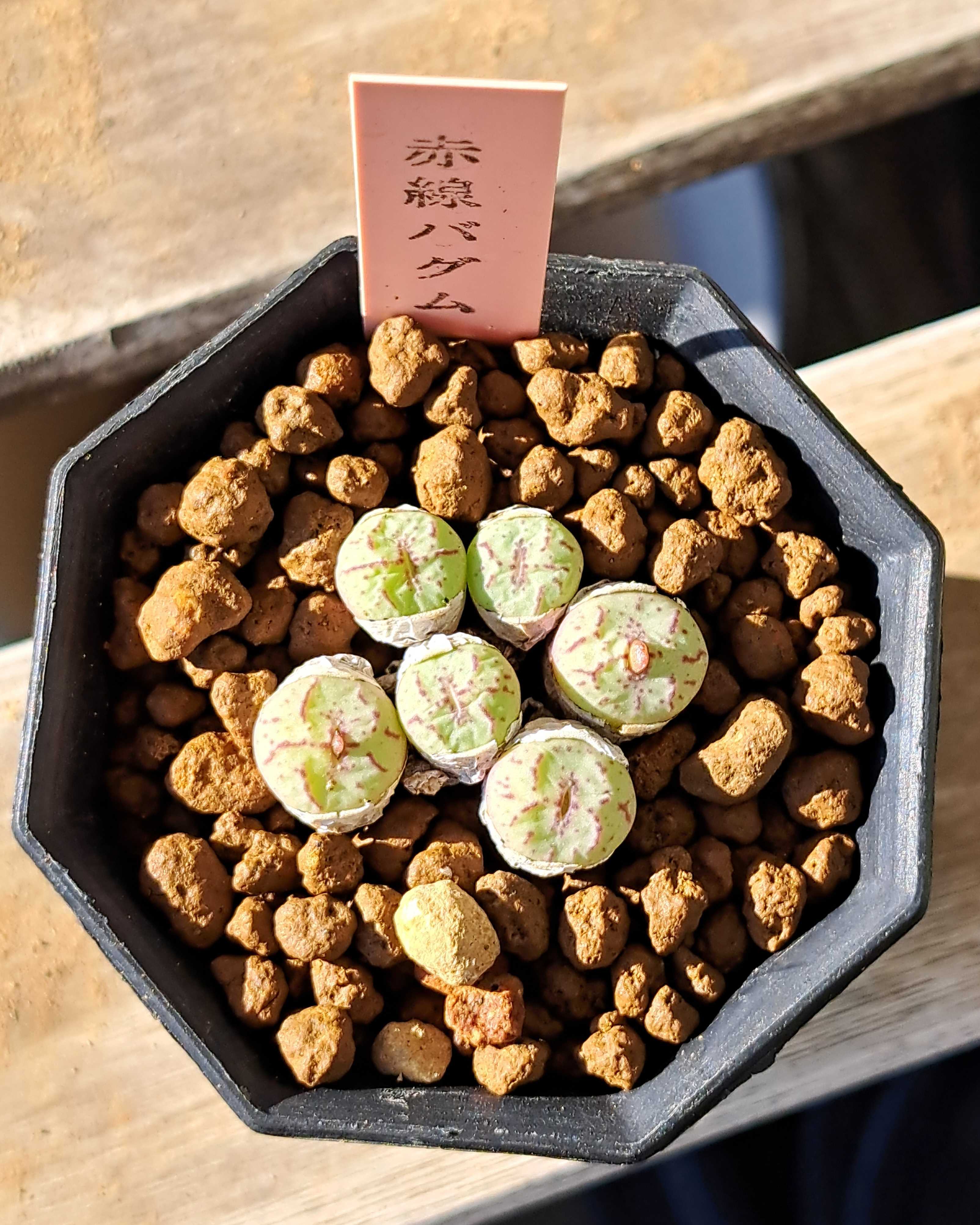 コノフィツムを4種購入した。全て植え替えて撮影したので見てみよう。赤線バグム。6頭立て。真円に近いカタチ。明るいミドリの球体にその名の通り赤線が走る。この配色が素晴らしい。拡大。素晴らしい色のコントラストだ。花芽も出てるね。ルイザエ。鞍型のコノフィツム。5対で計10個いる。名前には入っていないがコイツも赤線。やはりミドリと赤の配色というのは美しい。花も咲いている。丸もいいけどこのカタチもいいね。アゴの長い人の顔に見える。口だけののっぺらぼう。ウィッテベルゲンセ。すでに持っているウィッテベルゲンセだがコイツはちょっと表情が違う。タイプがいろいろあるのだろう。線が透明なものと赤いものがある。ハオルチアの万象みたいに日が当たると赤くなるものか?玉彦。線も何もないツルツルのシンプルなコノフィツム。シンプルながらもこの形状は面白い。やはりどうしても顔に見えてしまう。おちょぼ口ののっぺらぼう。おでことアゴが飛び出ている。う~ん。素晴らしい。線がなくても十分観賞価値があるぞ。とりあえず植え替えたのでしばらくは半日陰。徐々に慣らしてその後はひなたに置く。(多肉植物)コノフィツム 赤線バグム 2号(1鉢)観葉植物/コノフィツム:ルイザエ 2.5号ポット観葉植物/コノフィツム:ルイザエ 3号鉢植えコノフィツム・ミニマム ウィッテベルゲンセ 7.5cm鉢 カクタス長田 ハマミズナ科 原種系 冬型メセン 脱皮植物 多肉植物 女仙(多肉植物)コノフィツム 玉彦 2号(1鉢)