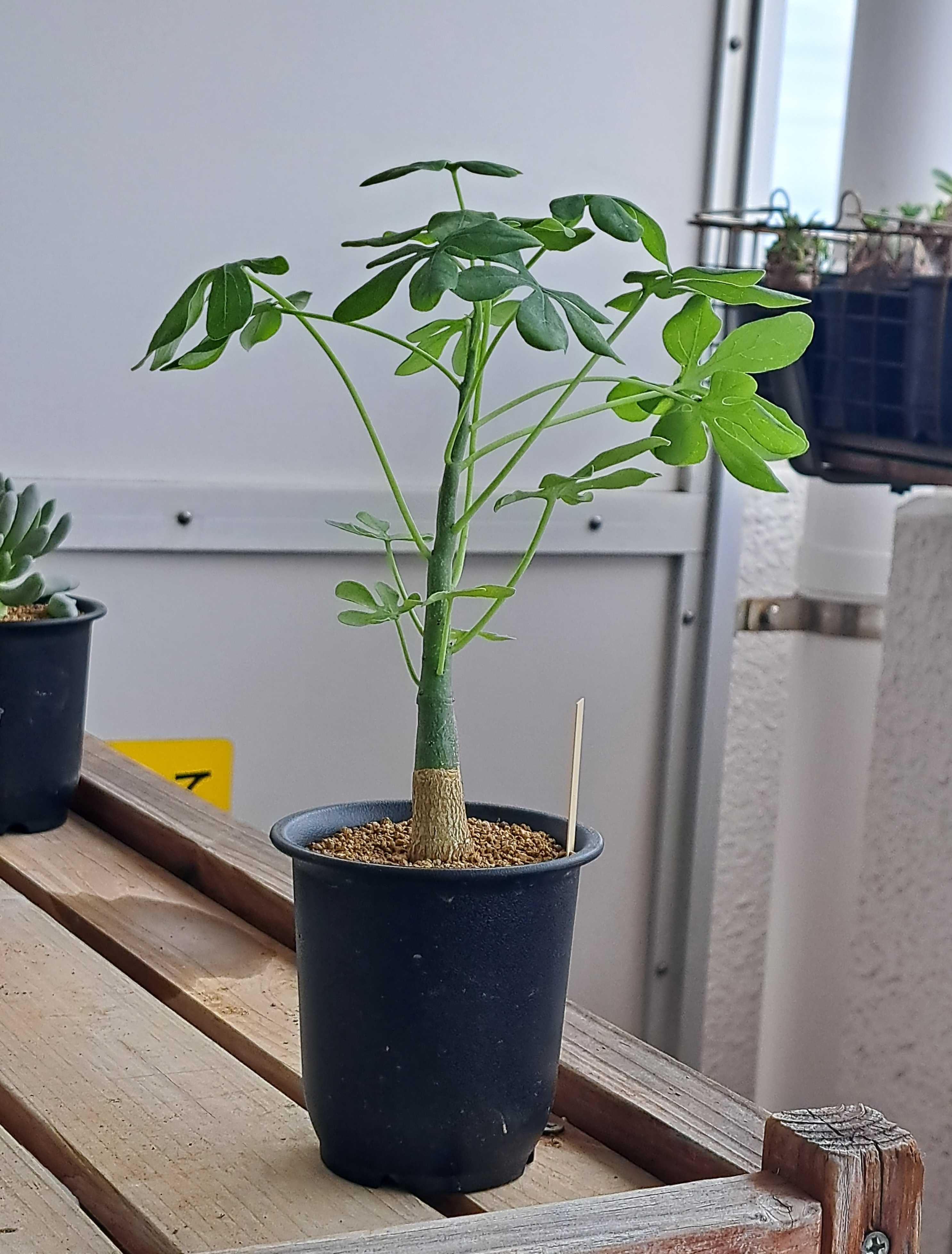 先月買ったばかりのボンバックス4号。2枚葉と3枚葉を持つうちで唯一のボンバックス。買ったときにはまだ3枚葉はなく、うちに来てから出たものだ。念願の3枚葉。嬉しい。と喜んでいたらまた出てきた。一度出たら次からは3枚葉が出続ける。コメントでそう教えて頂いたがその通り3枚葉。スゲー。連続で出るんだ。コイツ、下の方は1枚葉なんだよね。下2枚は1枚葉、そのあと2枚葉が出て、3枚葉が出たということだ。下2枚の葉は元々うちにいるヤツらの葉と大きさは変わらない。つうことは…ボンバックス1号から3号もある日突然2枚葉ないし3枚葉が出てきても不思議じゃないということだよね?ちょっと見てみよう。3枚葉出てないか?1号。出てねえ…。でも葉は4枚になった。今年はもう出ないだろうが来年には3枚葉が出る可能性もあるのではないか。2号。出てねえ…。だいぶ葉がデカくなっているからそろそろ3枚葉が出てもおかしくないとは思うのだが…。ま、来年に期待だな。3号。コイツだけ2.5号鉢で小っちゃい。葉も3枚しかない。まだまだだな。ところで…ボンバックス1号の茎。表皮が割れ中からものすごくキレイなミドリが露出している。これスゲー。茶色い表皮の奥にこんなものを隠しているのだ。何てヤツ。そして何コレ?これがボンバックス最大の魅力ではないだろうか。渋い茶色と宝石のような美しさの内部。このギャップの激しさ、落差。素晴らしい。多肉植物 osプセウドボンバックス エリプチカム ボンバックス実生 おもしろ多肉植物 7.5cm〜9cmポット(多肉植物)プセウドボンバックス エリプチクム 3号(1鉢) コーデックスプセウドボンバックス・エリプチクム (剪定・作り込み株) 9cm鉢 カクタス長田 強剪定 キワタ科 多肉植物 コーデックス 塊根植物 珍奇植物(多肉植物)一点物 プセウドボンバックス エリプティクム 5号(1鉢) コーデックス(多肉植物)一点物 プセウドボンバックス エリプティクム 5号(1鉢) コーデックス