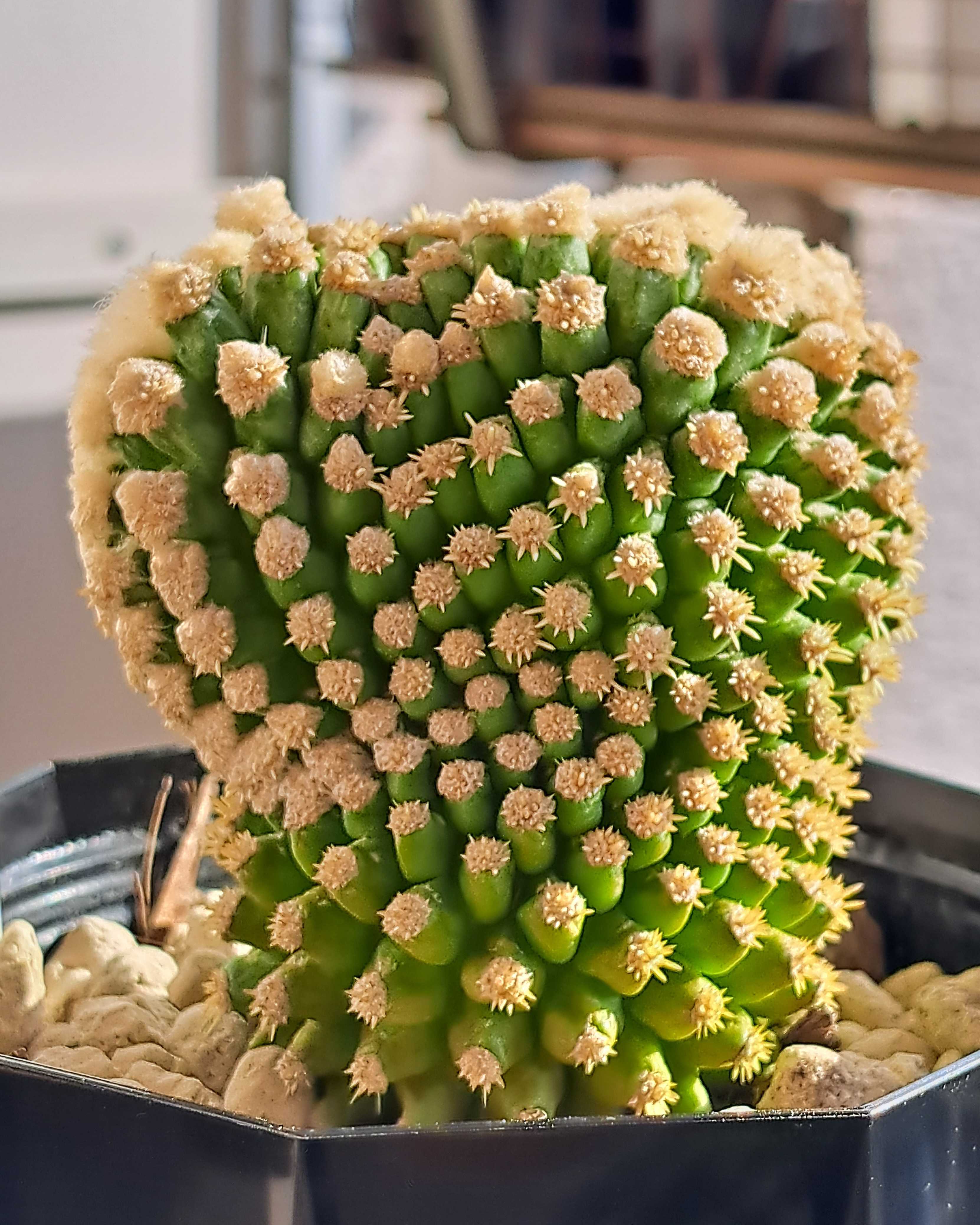 短刺白刺金鯱も去年の今ごろ買ったヤツだ。購入時と今の違いを見ていこう。購入時。昨年10月22日。現在。さあ、どう変わったか?画像を比べると現在の方の株元が細い。縮んだのではないだろう。上部が肥大したのだ多分。そのことで株元が細く見える。実際上部には成長のあとが見られる。てっぺんの左右が盛り上がっているし、いくつものイボが綿毛におおわれデカくなっている。上からの図でも比較してみよう。昨年10月22日購入時。現在。画像下の方白い綿毛のカタマリに変化が見られる。綿毛が増えて盛り上がっているのがここでも分かる。また、イボの変化も明白だ。先端に綿毛が玉状についたイボが数ヶ所確認できる。綿毛が異常に発達したイボと通常のイボ。通常のイボには綿毛はほとんどない。これが発達してカタマリになるのだろうか?もう秋も深まって来たし今年は期待できない。来年どうなるか見ることになるだろう。crnサボテン エキノカクタス 金鯱モンスト 自根 コロンカクタスさん苗 7.5cmポット キンシャチ CORONCACTUS 仙人掌 送料無料ギムノカリキウム・牡丹玉モンスト 7.5cm鉢 カクタス長田 サボテン科 多肉植物 ミハノビッチ 石化 サキュレントプランツ 珍奇植物 モンストローサ観葉植物/サボテン:ギムノカリキウム トニー モンスト 3号鉢植えサボテン:ロフォフォラ 銀冠玉モンスト*幅5.5cm 現品!一品限りサボテン:鸞鳳玉(らんぽうぎょく)モンスト*幅6cm ☆赤松実生 現品!一品限り