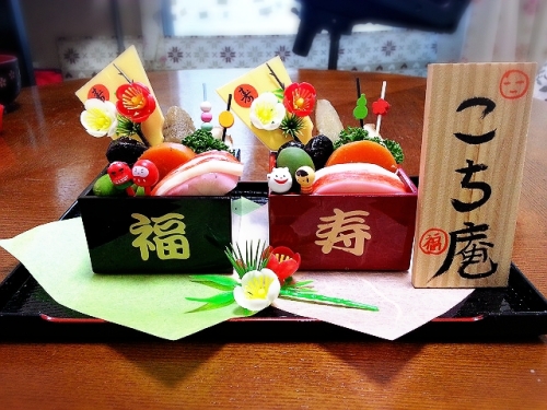 お祝い升おせちを作りました升の底には煮付けの八つ頭やこぶ等が入っていますちゃんと全部食べられる升おせちになっています手の平サイズで可愛くて美味しいですこち庵の看板もリニューアルです↓こち庵の祝い箸です明日は七草だねどんな七草粥にしようかな?