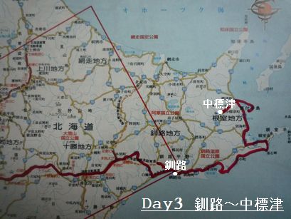 【9/02 (Day3)】08:00 釧路出発。厚岸から、北太平洋シーサイドラインで、浜中町へと向かいます。ツーリングマップルでおなじみの景色があちらこちらに♪鹿飛び出し注意の看板がやたらと目につきます。周囲は原生林、ガードレールや白線も無く、ライトに反射するものが何もありません。夜は月が出てなければ真っ暗だろな。浜中町に入り、霧多布湿原の手前にある琵琶瀬展望台で小休止。 霧多布湿原の南側の高台にあり、360度のパノラマが臨めます。道路を挟んだ北側には、霧多布湿原の中を琵琶瀬川が蛇行しながら流れている様がのどかです。小さん、ここでおやじギャグを一句残し、トイレへ消えます。湿原に出現、あれ、湿原で失言。どうでしょう?しばらくして、トイレから小さんが小走りで戻ってくる。あの人、男かな?女かな?失礼な奴だなーと思いながらも、そちらを見る。顔と体は完璧なおっさんですが、中途半端な女装…ポニーテールにピンクのカチューシャ、華奢なサンダルから見える足指には真っ赤なペティキュア。醸し出す雰囲気は会社の重役風情…キレイに女装する人が多い昨今、あまりの完成度の低さに驚愕しました。根室の落石方面へ走ります。 途中、キタキツネが道を塞ぎます。北の国からのロケ地・蛍の駆け落ち先、落石診療所に寄り道。今は普通に人が住んでいるので、遠くからズームでパチリ☆北海道三大秘岬・落石岬へ。ここはまったく観光地化されておらず、アクセスにも時間かかる穴場的スポット。地理的には、根室の市街地から約20キロの場所にあります。泥を跳ねあげながら、ダート道をザクザクと走り抜け、行き止まりまで突き進みます。行き止まりのゲートから落石岬まで、木道を徒歩で片道1.4キロ。 とっても長い道のり、途中、たくさんの鹿に遭遇しました。落石岬の先端にある落石岬灯台。船越英一郎が居そうな断崖、太平洋の荒波が打ち寄せます。いい運動になりました。ここから北上、標津町のR244から、野付半島の先端を目指します。野付半島は根室海峡に細く延びた約20キロある半島です。野付半島ネイチャーセンターのトドワラ食堂で昼食を。ご当地グルメとして売り出し中の 「ジャンボ帆立バーガーと別海牛乳」 を頂きました。 小さんは、トドワラ定食を。 うまうま☆野付半島から北方領土・国後島までの距離は、根室海峡の野付水道を挟んで約16キロ。ネイチャーセンター周辺からは国後島が良く見えるそうですが、曇りがちで拝めず。さて、ここから、トドワラまでの遊歩道を歩きます。 トドワラとは、海水と潮風の影響で、トドマツが立ち枯れたものです。陸地だったトドマツ林の大地が、長年の海面上昇や地盤沈下により砂嘴となり…樹齢100年以上のトドマツが枯れ、あちらこちらで倒木。実際訪れてみると、荒涼とした奇怪な風景で、もの悲しさが漂っていました。 このトドマツの浸食は現在も進行中で、そう遠くない時期にトドワラ跡地となるようです。時代の流れとともに消滅してしまう貴重な遺産。見ることができてよかったです。鹿も間近で見ました。 いい運動になりました。中標津町まで走り、おっきな鮭の頭のオブジェと戯れる。さてさて、雨が降ってきました。予約しておいた中標津の安宿にチェックイン。フロントで手続きをしていると、背後に気配を感じ…振り返ると、今朝、琵琶瀬展望台で遭遇した、ピンクのカチューシャにまたも遭遇!!小さんを見ると、驚愕のあまり固まっているご様子。琵琶瀬展望台と、そこから100キロ離れたこの宿で、同じタイミングで時間を共有する。ファンタスティックですねさて、部屋に荷物を運び、とりあえず汗を流しましょう。温泉でザブンと温まり、夕飯のお時間。4000円の安宿ですが、朝夕2食付です。食堂に行くと若干混雑しており、「相席でもいいですかww」 と、宿のご主人。通された席には、ピンクのカチューシャ!!衝撃の相席 美味しく頂きました。食後はホテル正面の本屋で立ち読み。シュールな1日でした。Day4 へ続く…