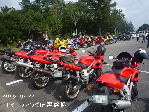 東北ミーティングに参加しました☆行く前は、TLの集まりにPS号で参加するのは、ちょっと気が?(腰が?)引けていましたが…皆さん、とってもステキな方ばかりで、それはそれは楽しく過ごせました。**********************************************************08:30 出発下道で裏磐梯まで、ノンストップ160キロ。この前、劣化でもげたウィンカーもちゃんと直しました12:00 道の駅・裏磐梯 到着。すでに30台近いTLが整列していました。関東地方からの参加が7割、東北・近畿・北陸・四国地方からの参加が残り3割くらい。すぐに、よっちんさんが駐車位置を誘導してくれます。小さんのTL号は、同じ年式の赤が集まるエリアへ。さるこさんのPS号は、違うバイクが集まるエリア(部外者エリア?)へ(笑)よっちんさんのTL号は、オールペイントを施したスポンジボブ仕様。ものすごいコダワリ様は、もはや芸術の域唯一の女性ライダーさんは、ハーレー乗り。出会った瞬間、すっかり意気投合彼女は長野県の方、お仲間のTL乗りに便乗参加。なんと、さるこさん達が、以前住んでいた上田のアパートの数軒お隣さん連絡先を交換して、ツーリングのお約束さっそく計画しないとだけど…TLの皆さんは1000cc、ハーレーは1600cc!!力の差は歴然気合いでカバーしないと長野県人どおし、みんなで喜多方ラーメン途中、どんどん相席が増え、みんなでラーメン囲んでワイワイガヤガヤ色んな方とお話できて、とっても有意義でした。小さんも希少なTL乗りの方とたくさん出会え、お話できて嬉しそう。顔が生き生きしてました14:45 記念撮影して解散。【ツーリングメモ】距離: 337km時間: 6時間30分天気: 快晴気温: 20~26℃燃費: PS号 34.3km/L, TL号 18.5km/Lああ、楽しかったww