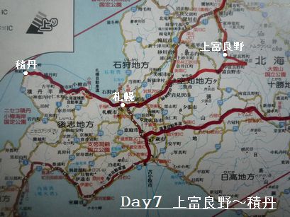 【9/06 (Day7)】この旅も残すところあとわずか。上陸地点、苫小牧のすぐ近くまで戻ってきました。異常気象に弄ばれ、少々お疲れ気味です。朝食を食べて、08:00 出発。美瑛・白金温泉近くにある 「青い池」 へ。10数年前に訪れた時は、誰も居ませんでしたが…昨年、青い池の写真が、Mac OS の壁紙に採用されてから、世界的有名な池に変身。人だらけ☆【画像拝借】白樺林の中にある池の青色が謎めいており、立ち枯れた木も神々くて。その色は刻一刻と変化。壁紙で見た、絵の具のようなケミカル感には出会えませんでしたが…。ビヨーンとパノラマで☆十勝岳スカイラインで中富良野を通過、布部の札幌軒へ。北の国からで有名なラーメン屋さんですが、10年前からお気に入りの一店です。サッポロラーメン専門店なので、迷わず 「味噌ラーメン」 を注文。札幌には、ここより美味しいラーメンはいくらでもあると思いますが…。さるこさんは、ここの味噌ラーメンを食べると、いつも幸せな気持ちになります。さて、ここから一気に積丹半島・神威岬を目指しましょう予報では終日雨模様。今回のツーリングのメインは、「東の知床、西の積丹」 と言われる2つの秘境。4日目、終日雨の予報だった知床半島で、奇跡的な快晴に恵まれました願えば叶う奇跡を信じて走りましょう三笠IC~小樽ICまでワープ!!途中、札幌でゲリラ豪雨に遭遇。これしきの雨、もはや小雨程度にしか感じません。分厚い雲に覆われた札幌の空。神威岬までは、ここからたったの60キロ。シャコタンブルーは無理かなァR299で、小樽~余市~岩内と走り、日本海に向かって大きく膨らむ積丹半島に踏み込む。その突端に、細く長く突き出る岬が 「神威岬」 です。R299が開通するまでは、海岸沿いにある真っ暗な念仏トンネルを通り抜け、断崖絶壁の崖下の危険な道を、波しぶきを避けながら歩く以外、アクセス方法はなかったそう。岬まで10キロのワインディングその時、太陽を覆っていた雲が一斉に過ぎ去り、巨大な岬が眼前に広がった!!ォ━(#゚Д゚#)━!! 歓喜のあまり、左手を高々とあげながら走る小さんの姿が、きらめく太陽光の中に消える。駐車場にバイクを停め、はやる気持ちを抑え遊歩道へ。強風時には閉門するそうなので、運も必要みたい。眼下には青い海が気持ちいいね。「チャレンカの小径」 と呼ばれる馬の背状に迫り出した岬の遊歩道で、先端までは片道20分。シャコタンブルーと馬の背のグリーンが、どどーん と見事なコントラストでしたォ━(#゚Д゚#)━!!アップダウンを繰り返す事20分。滑落すればまず助からないスリリングなコース、高所恐怖症の小さんは歩き方がぎこちない。おもらししたみたい(笑) 先端まで歩くと、白と黒の 「神威岬灯台」海面に浮かぶ奇岩の中で、1本だけ垂直に立つ岩が 「神威岩」 です。岬の先端から臨むその姿は、ひと際目立ち、自らの存在感をぐいぐいアピールしてきます。神威岩の先に夕日が沈む…キレイだなァ帰りましょうか…灯台をあとにする。岬の反対側から。16:30 神威岬から10キロ戻ったところにあるお宿にチェックイン☆積丹半島で、唯一自家源泉を持つお宿です。まずは、温泉温泉♪お湯に浸かると、全身が大きな気泡でびっしり包まれ、湯面にピチピチ跳ねる。気泡を手で払うと、シュワシュワーっとサイダーみたい。18:30 夕食。食事は、積丹で取れたての海産物がずらりと並び、食べきれないほどこのあと、まだまだ出てきました。 他のお客さんや、宿のご主人を交え、宴は22時まで続く。昨日・一昨日までの逆境がまるで夢みたい…最終回 Day8 へ続く…