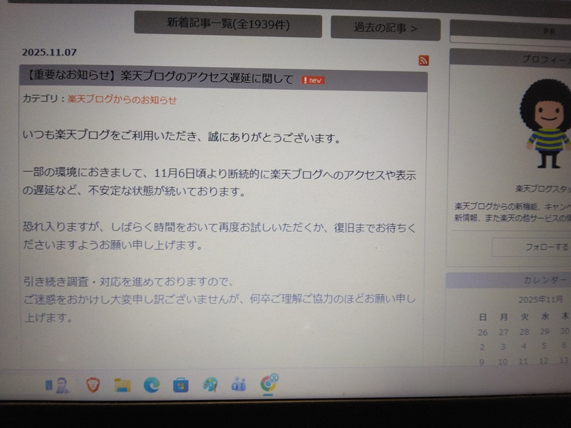 楽天ブログの調子がおかしいです。昨日(11月7日)、ひさしぶりにブログを書こうとしたら管理画面になかなか入れず・・・途中で plaza.rakuten.co.jp からの応答時間が長すぎます。のエラー表示が出たり、やっと入れて記事に画像を貼り付けようとしたところでエラーになって他のブラウザで『管理画面』→『日記を書く』を開こうにも上記の plaza.rakuten.co.jp からの応答時間が長すぎます。で、オシャカになったり・・・なにかの拍子?に運よく?『日記を書く』が反映されたり写真が貼れたりもあるようですが、とぎれとぎれでつながらないのは、すごくストレスフル😵💫。他の楽天ユーザーのみなさんの記事、楽天ブログ・・・おかしくないですか?楽天ブログ、どうなってるの? 日記すらアップ出来ない!!楽天ブログ絶不調さすがにブロガーさんの抗議にあらがえなくなったのか、楽天スタッフブログのコメント。いつも楽天ブログをご利用いただき、誠にありがとうございます。一部の環境におきまして、11月6日頃より断続的に楽天ブログへのアクセスや表示の遅延など、不安定な状態が続いております。恐れ入りますが、しばらく時間をおいて再度お試しいただくか、復旧までお待ちくださいますようお願い申し上げます。引き続き調査・対応を進めておりますので、ご迷惑をおかけし大変申し訳ございませんが、何卒ご理解ご協力のほどお願い申し上げます。わが家の回線やPCの問題ではないらしいとわかり、すこしホッとしましたが・・・上記のみなさんの記事も、拝見できるかいつまた拝見できなくなるのかわからない(困)のは、ひじょうにプレッシャーかかります。サイバー攻撃か、そのほかの原因なのか・・・『楽天写真館』は、(私は)閲覧できるのですがブログのみの問題!????これから、あげたい日記がたくさんあるのですが(泣)、すみやかに復旧してくださることをねがうのみです😓。
