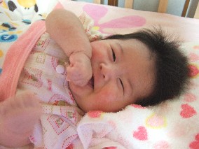 ばーばにあやされニコニコ笑顔で答える彩桜ちゃん