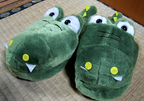 世界中に不景気の嵐。我が家にもトンデモないくらいの影響を及ぼしてしまい、状況次第では沖縄旅行も中止になるかもしれないというトコまできそうな程でした。とりあえず沖縄は行けそうなので、ホッとしていますけれど、今後の生活は節約に次ぐ節約で何とかやりくりして行くしかありません。自分も趣味に使えるお金を最低限のラインまで抑えなくてはいけませんね。ま、暗く考えるとキリが無いので、知恵と工夫で明るく行きましょう。そんな状態での昨日のコトですが、土曜出社を終えて帰宅すると、家族も買い物から帰ってきた直後だったようです。食料品やら雑貨が部屋に広がっている状態でしたが、その中を良く見ると・・・がお~ワ、ワニさん!?「行った先の店で父ちゃんが気に入ったから買って来た」んだそうですが、これは、う~む・・・。「でね、コレは父ちゃんが気に入ってるからね・・・」おい、ちょっと待て。何だよコレはって・・・と不安を募らせるワシの傍らでガサゴソと袋をさばくる母ちゃん。やがて出てきたのは・・・げこカ、カエルさん!?「コレはアンタ用ね♪」・・・。・・・。・・・。なあ、家計も相当キツくなって来るんでしょ。メシの献立も作り置き出来るようにして、工夫するとか言ってたぢゃん。ワシだって、本やら何やらの余計なモノを買うのは控えなきゃねと話たトコぢゃん。なのにその舌の根も乾かぬうちにワニさんとカエルさんを連れてきてどうするつもりじゃい!!と正直腰砕けな心境ではありますが、「人間ユーモアも必要だ」と白戸家のお父さんあたりがオチに使いそうなコトを仰る我が父ちゃん。・・・もうこうなったら大事に使うしかありませんわな。(って使う気まんまんやんけ)んがっ!!ここで緊急事態が発生!!なんとワニさんの片割れが目に大怪我をしていたのでございますっ!!すっとぼけたマヌケ面をして、気丈に振舞っている様子ですが、既に内臓が見えてしまっているのであります。このまま放って置くと、更に悪化してしまうのは目に見えているので、緊急外科手術と相成りました。発見が早かったのと、外科医(母ちゃん)の手際の良いオペにより、ワニさんの怪我は見事完治致しました。元気になって良かったね~