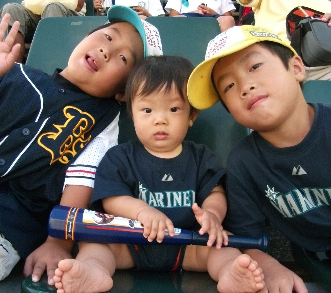 我が家の長男は野球小僧なんです。1年生になった去年の春からいわゆる少年野球チームに入り(弱小ですが・・)まあ地道に練習をしています。毎週土日は野球漬けでお父さんまでコーチで借り出されほとんど休日のない我が家。本人がやりたいという分にはいいかな~と思いますが、弟君たちは大変です。1年生の次男は最初自分もやると言ってはいたが、暑さと遊ぶ誘惑に勝てずまだ入団を見合わせています。三男坊はかわいそうに練習や試合に連れまわされ春先には発熱しました。なので今年の夏はさすがにあまり連れて出ていません。そして今ハマっているのがプロ野球基本はお父さんに合わせて巨人ファンなのですが一応地元で試合も見に行きやすいってことでパリーグではオリックスを応援しています。親はブルーウェーブ時代から応援してますしね。学校でよくもらってくるのが小学生招待券今年も2回利用させてもらい、夏休みに観戦しました。スカイマークだけでは飽き足らず一度は京セラドームにお父さんと二人で行き新学期始まって早々にも一度行ってもう今季は終わりだよ~と言ってたのに・・・。またまた週明けに招待券をもらってきたものだから、せがまれて昨日行ってきました。学校から帰ってきて(宿題は学校で済ませてきた。こういうときだけちゃっかりしてます。)本読みだけさせて出発我が家からスカイマークスタジアムまでは片道約40分、もう少し近かったらもうちょっと頻繁に行けるんですがね。行けるだけましか。なぜか二男と三男はマリナーズ仕様です。ただし、約束として7回裏終了で観戦は終了。翌日学校ですからね。ちなみに息子はT-岡田の大ファンです。なにしろ去年初めてスタジアムに行ったときにT-岡田がプロ入り第1号のホームランを打ってそれから大活躍しているもんですっかりファンになってしまいました。残念ながら肉離れで戦列を離れ昨日もスコアボードに名前がなくとても残念がっていたのです。私たちが帰ってから8回裏に代打で出てきて満塁ホームランを打ったことは、ちょうど風呂上がりにプロ野球ニュースを見た時に知りました。大喜びなのですが・・心境複雑。もう少し残ってあげればよかったかな。朝学校に行くときにも、一言・・。「僕まだ満塁ホームランを生で見たことないねん・・。」ごめんよ~息子。それにしても肉離れでテーピングがちがちにした状態で走れないだろうし、ホームランなら全力疾走する必要なし恐れいりました。パリーグ大混戦で面白くなってきましたね昨日はスカイマーク今季最終戦。平日だというのに結構満員でした。今回はいつもより多い500発の打ち上げでした。今年最後の花火です。