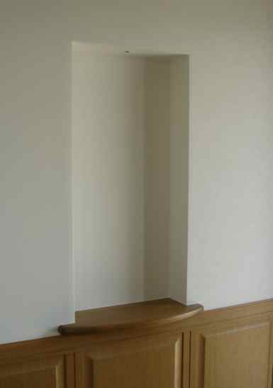 昨日はクロス貼りも大詰めでついつい面白くて観察していました。貼っているところを見た事のある人にはわかると思いますが、カッターでスーっと切って貼っていく姿はなかなか見ものでした。継ぎ目なんか近くで見ないと全然分からないです。ところでニッチが出来上がってました。我が家は玄関を入って正面にクローゼットがあるのでニッチは右側につけました。クローゼットにも棚が出来ていてクロスも貼ってあったので見た目がとても明るくなりました。まだついてませんが右側にはポールが入ります。棚板の奥行きを枕棚に合わせて左半分だけにしたのは右側はコートなど服を掛ける場所にして左側は前にも言ったパパの道具入れになる為。スキー板など長い物は手前に置けるようにしてあります。この私の無茶な注文を棟梁は快く引き受けてくれました勝手口にはちゃんと踏み台と階段もついてました。左官屋さんはこのとき隣のテラスを仕上げていました。鮮やかな手つきはさすが職人技こんなところも・・・エコキュート設置予定場所