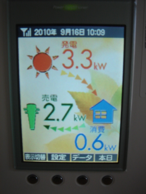 昨日から始動し始めた太陽光発電。。。昨日(9月12日)の発電量はたった2.7KWでした。昨日は結構曇っていてまあ仕方ないかな~と諦めて・・・。今朝は朝6時半に起きてモニターを見てみるとぼちぼちと発電が始まってました。仕事に行って帰ってみると本日の累計発電量は17.8KW(午後4時現在)売電量も12KWを超えていてひとまず一安心。今日も昼ごろは結構雲がかかっていたので心配しましたがどうにか目標の売電量は達成しているようです。遅ればせながら我が家の太陽光はサンテックパワー社製のもので1.9KWのパネルを東西に10枚ずつと南に10枚で合計29枚(5.51KW)となっています。残念ながら今日の最大発電は目で確認できていないので不確かですがモニターの履歴によると3KW弱といったところでしょうか?快晴ではなかったのでやむを得ないか・・・。午後5時を過ぎたところ発電量が消費量を下回り売電はもう難しいので本日の売電は多分打ち切りかな。13KWの売電のため48円/KWで計算すると624円となります。これを1カ月ペースで換算すると約18000円の収益となる予定???また1カ月単位での発電量・売電量をまとめたいと思います。そのうちモニターなどの写真も掲載できればと思いますが、いつになることか・・・。合わせてサンテックパワー社製の太陽光発電についても私なりの感想を述べていこうと考えています。
