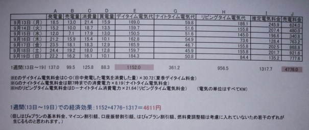 1週間分まとめてみました。少し見にくくてすみません。本日は連休最終日、あいにくの曇り空自給分のみの発電にとどまっています野球少年たちにとってはしのぎやすい1日なんですけどね。