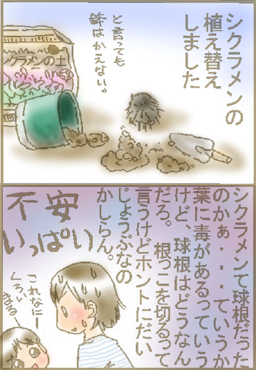葉に毒があるんだから、根もあるよね?( ̄Д ̄;)怖いので、根のからんだ土は畑に戻さず、朝顔のプランター土にしました。毒といえば、アジサイも水仙も毒もってるようですねー(-_-)枯れた葉っぱとかは、きっちりゴミ袋に入れて捨てるよう心がけてますが、間違って口に入らないように気をつけねば、ええ、特に娘!庭に生えてる野菜をちぎって「食べよう?」とか頻繁に言うしねー、、、よおおおおおく言い聞かさねば、なにしろ最近アジサイの挿し木にトライ中でうまくいけばお庭に仲間入りだし、水仙もバッチリあるのよ(^^;)さて、ハナシは戻して、シクラメン。我が家のシクラメンは完全に葉が落ち休眠してたので、何の気遣いも遠慮もなく進行(笑)せいぜい気を使ったのは土くらいかな。ていうか、土の配合が面倒くさかったので、専用土を買ってきました。鉢にたいして根っこがそんなに多いわけではなかったので、全体にざっと根を落とすくらいにし、土入れて植えました。って、こんなんで良いのかなー。間違ってないのかなー。心配。というか、秋にちゃんと芽でてくれるのかしら・・・そっちのがもっと心配。