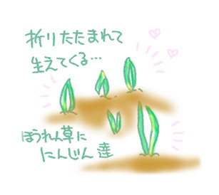 1週間前に撒いた、にんじんとほうれん草の種がようやく可愛い双葉になりました!お行儀よく、二つ折りになってお辞儀しながら生えてきたよ。大人の野菜からは想像もできない可愛さです♪いやぁ、こんな芽を出すなんて知らなかったよ。どうやって大きくなってゆくのか楽しみです(^^)しかし・・・今あんまりにも似た芽なので見分けがつかない(^^;バラバラ撒きのトコなんて、どれがどれやら(笑)まぁ大きくなれば違いが出てくるでしょう