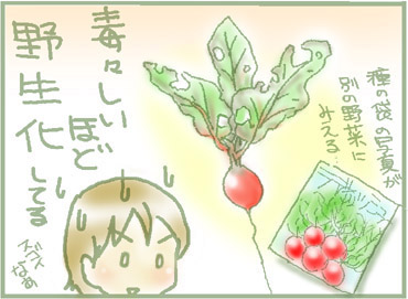 自然農法の野菜たちは、草や虫と共存して育ってゆきます。我が家の土は、耕して間もないので草すら生えてませんが(^^; 虫は結構来ました。今では蝶の巡回路になってます。なので当然、虫食いだらけ(笑)しかし面白いことに、虫たちが食べてゆくのを放置して丸裸になり枯れる葉と、そうでない葉に分かれてゆくんです。間引かなくても勝手に生存競争で淘汰される(間引いたのは発芽してすぐの頃1度のみでした)そうやって生き残った野菜は、強い。その恵みを、人間が頂きます(^-^)初収穫のラデッシュは、小さくて薄い緑、赤黒い葉脈・・・すごく草っぽかった(^^;;; これが「野生化」というものかしら、と思いました。え、(´▽`) 味ですか?かじってみたら水々しくて柔らかくてびっくりしたよ!残り数本は、お味噌汁にしたけど、水々しく柔らかい食感。葉っぱはちょっと苦くて、濃い青々した味がした。でもね、美味しい、とはちょっと違った。いや、もちろん美味しいんだけど、今まで宅配の無農薬野菜とか有機野菜を食べ慣れてるせいかな(有機農法の野菜って甘くて濃くて美味しいじゃない?)でも、うちの野菜はそういう甘さというか肥えた感じが全然しないのよねえ。あ、でもね、食べるという行為と共に、生き物の強いエネルギーを頂いた気持ちになりました。ある意味、なんか、身体に良いー感じ。心身ともに健康になりそーです(⌒-⌒)でも有機肥料とか、一度はあげとけばよかったかなー。もちょっと沢山たべたいよ(よくばり)第二弾のラデッシュがマリーゴールドの周りにスタンバイしてるので、あと二週間後が楽しみです。