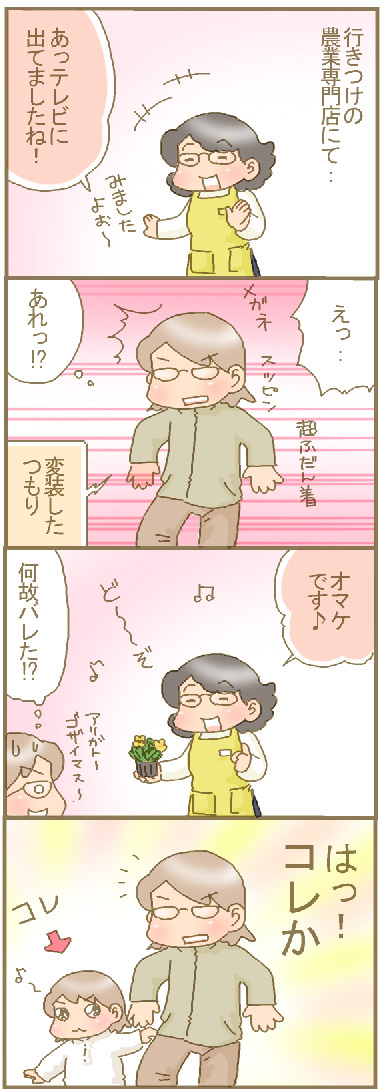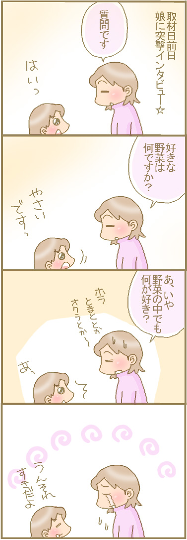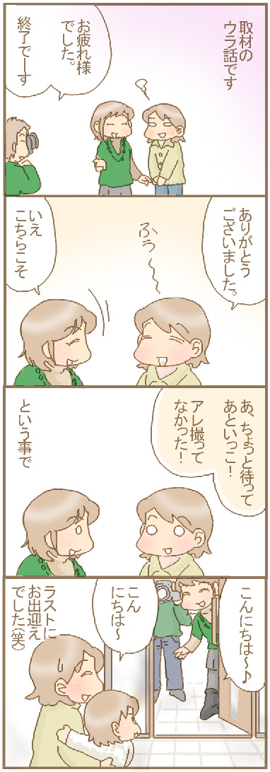 昨日はテレビの取材でした(≧▽≦)今日は、その様子を4コマにしてお送りします。てな感じで、へろへろ主婦っぷり全開なさとでした。へっぴり三文芝居ちっくなワタシを観たい方は三重テレビの「とってもワクドキ!」2月12日(木)夕方6:00~6:55の枠内にてオンエア予定ワイヤーママの紹介コーナーへどうぞ☆取材は楽しかったけど、出来は・・・(-_-;)きのうのシオの4コマネタ、笑えないよ・・明日はわが身だったのね、うん、血は争えないな。こうなりゃ自分を笑い飛ばすしかありません(笑)はっはっはっ (T▽T) ・・・・・あはぁ(涙)ということで、悔し紛れに こんなページ 作りました。というか、このページ去年の11月からあったんですがいったい何人の人が気付いていたかしら(^-^;?テレビと雑誌で言えなかった事を、描き綴りました。あたしゃ所詮モノ描きなので、紙の上でのリベンジするさ(-_-;)ランキング参加中です(^^)応援お願いします♪目指せ50位内♪