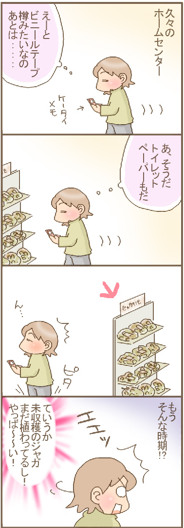 先日、買い物に行きました。じゃがいも、2月末から植え時ですって!さぁ、やってきました夏野菜準備の期間。またもや、畑の配置図とにらめっこする時間が長くなりそうです(笑)いいですよねえ~~~楽しい時間ですよねえ~~~♪うふふふふ(^^)あ、ちなみに、じゃがいもまだ掘ってません。じゃがたち・・・まだ芽が出てませんようにというか、出てたらそのまま植えておこっと(笑)ランキング停滞中です(^^;)もちょっと上げたいな・・・とりあえず・・・やっぱり目指せ50位内(苦笑)