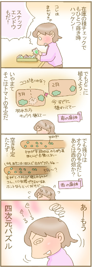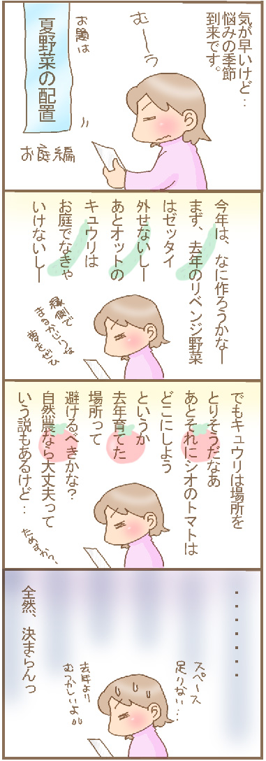 本日、二度目の更新です。ちなみに、一度目の更新は、芽キャベツくんです。記事は下のほうにあります、宜しければ読んでってくださいね(^^)さて、本日の4コマいってみましょー・・・去年は開墾中で、間に合わない~~~なんつって勢いで買っては植えて・・・って、やってたけど今年は準備万端にできるから嬉しいっ(^▽^)ノとはいえ、マジ悩むわ~~~オットとシオご希望の、トマトとキュウリは必須オカズに便利な、ニラ、ナス、ピーマン、インゲン、夏大根あと、各種 葉もの野菜のリベンジもやりたいっ!もーお庭で育てたいものが沢山ありすぎ~~(´▽`)はーあ (^o^)=3嬉しい悩みですね♪皆様の畑、今年はなにを育てますか?スペース? だいじょぶホラ、自然農って小さめ野菜じゃん?なーんて鋭い指摘で楽天家の貴方。いつも押してくれてますね?ありがとう(^^)お陰様で、ランキングも上がってます! ↓ ↓ ↓ランキング参加中です(^^) ポチッと応援お願いします♪