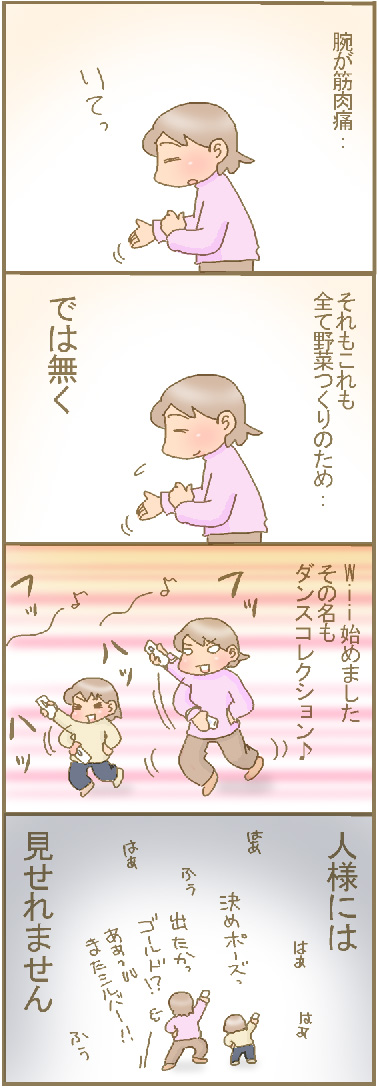 あはっ、もう大ハマリ(≧▽≦) ノ実家からWii借りちゃったんだー(≧▽≦) !でもって、ハッピーダンスコレクション購入!ダンスレボリューションと 太鼓の達人を 足してアイドル育成シミュレーションからませたみたいな?組体操とか、創作ダンスとか超苦手な私ですが何故だか ソッコー はまりましたヾ(´▽`)でも嗚呼窓を締め切りカーテンをひき、ひたすら踊りまくる主婦(3◎才)見せられんっこんな姿オットにも見せられんっ( ̄ロ ̄|||)秘めやかなる、ムスメと二人きりのオンステージ♪めくるめく挑戦、ほとばしる汗と努力3日でストーリーモードクリアしちゃったよ(´▽`)私ってば宇宙一のダンサーになっちゃった♪今、オンステージモードの金メダル集めてます(^^)ごめんね、今日はゲームネタ。って、誰かやってる? これ、面白いよね?・・・そか、今日はゲームネタか。よくわかんないけどこの調子で野菜作りも宇宙一よろしくね・・・というそこの貴方。すんません次期野菜育成に向けて、体力つけてます(笑)明日の活力に向けて、クリックお願いします(≧▽≦) ↓ ↓ ↓ランキング参加中です(^^) ポチッと応援お願いします♪