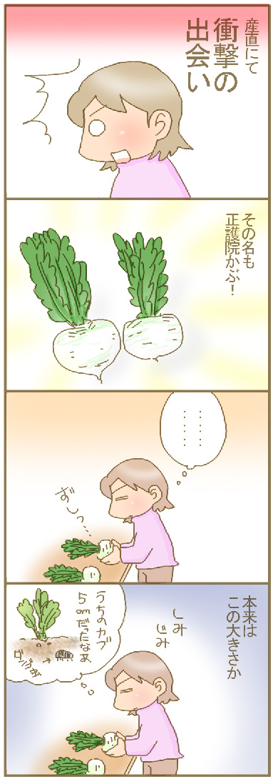 買って帰りました。ホクホクして美味しかったです (´▽`)一方我が家の、広い畑の正護院かぶ(昨年秋に蒔いたやつ)5cmしか育っていなくて最近トウ立ち始まりました(´△`;)あ~~~間引きのつもりで抜いてきた、ちっちゃい苗実を切ったら、早くもスが入っていたよ(´▽`A あはは蒔けば育つってもんでもないのね。蒔く時期も大事なのね。ちなみにランキングは1日1回が有効です。是非、押してください、お願いします(≧▽≦) ↓ ↓ ↓ランキング参加中です(^^) ポチッと応援お願いします♪
