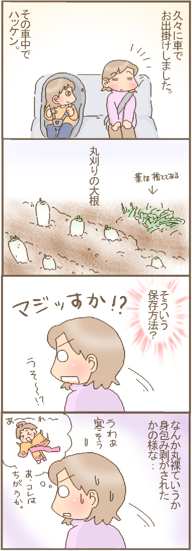 昨日のことですめっちゃ寒そうで なんか可愛そうでした~(ノω・)しかし、分からないのはその理由。なぜ 身包み剥がされているのかっ!じゃなくて(-_-;)葉が刈られて 埋まったままなのか!・・・もしかして何かの保存テク?・・・もしかして何かの秘密儀式?・・・もしかして大根のストライキ?・・・(・_・;)色んなことが頭をよぎりますがともかく只者ではない秘密が潜んでいそうです。わーん理由、気になるう~~~!どなたかご存知な方いらっしゃいますかしら?知ってたら、教えてくださーい(^^;)大根娘?今日のテレビのさとの事?ってか娘って歳でもないよね?と、そう思ったドキワクを見た貴方。ハイそのとおりです(T▽T)でも心は娘のままってことで! さぁ嘘でも1票お願いします是非っ ↓ ↓ ↓ランキング参加中です(^^) ポチッと応援お願いします♪