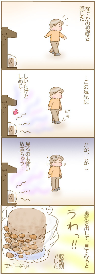 ありがとうございます!アクセスが3万ヒットを超えました(^^)これも全て、毎日通っていただいた皆様のお陰です。これからも頑張って更新してゆこうと思っていますのでどうぞ、宜しくお願いします!・・・ところで3万ゲットした方ってどなたかしら?(またしてもアクセス記録から判明できません(-_-;)身に覚えのある方、どうぞ名乗りを挙げて下さいますと嬉しいです。ささやかですが、オリジナルTシャツなんかを作ったりなんかしてプレゼント出来たらなぁ・・と考えております♪ということで、御連絡お待ちしてます(^o^)さてお待たせしました、本日の4コマをどうぞ☆ステキ!なめこ!10日ほど放置したうえに、枯らしちゃったのでもー殆ど諦めて放置してたんですが、この状態!ちゃんと応えてお世話しなきゃ(≧▽≦)あ、ちなみに しいたけは変化ナシでした。ランキング停滞中(^^)もちょっと上げたいな・・・とりあえず・・・やっぱり目指せ50位内(苦笑)