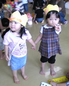 今日はA幼稚園の未就園児教室に行ってきました。テーマは「絵の具で遊ぼう」絵の具、えのぐ、えのぐ、、、、(;´∀`)嫌な予感でしょう?(笑)もちろん汚れても良い格好での参加。すご~~~く、参加人数の多いA幼稚園。大人気の幼稚園です。作ったのは王冠。ぺったんぺったんエアキャップで作ったハンコを押して完成です。今日はお友達のもえなちゃんも一緒です。王冠ができあがるとね、あやたん「お家帰ろうか!」だって。もうひとつのB幼稚園に行ったときは絶対言わないのにな。参加人数が多いのにここの幼稚園、この未就園児教室を担当している先生はたったの二人・・・。一人は先生というよりかはアシスタントのオバチャンって感じで。なんだかなぁ~、、、って思わずにはいられなかった。もうすぐ運動会なので幼稚園内ではお遊戯の練習があってたよ。曲が嵐の【Love so sweet】だったり、あいのりのテーマ曲の【My Love】だったりと、、、、なかなかおっとな~(笑)王冠を作ったあとは園庭で遊んだよ。園児達も遊んでたけど、みんな裸足でどろんこでした。健康的で元気いっぱいって感じ?あやたんも遊具で遊んでたけど、早速砂をかぶったりお口に砂が入っちゃったりで、大変でしたーーー(*+ω+)昨日のB幼稚園の入園説明会、今日のA幼稚園の教室を終えて、、、ママは決めちゃいました。幼稚園をどっちにするか。6月からどっちの幼稚園も同じくらいの頻度で見学に行ってあやたんにとってどっちがいいのか、すご~~く悩んだ。で。決めたのは「B幼稚園」古くて小さい少人数制の幼稚園。今日、A幼稚園に行って思ったの。こんなに人数の多い幼稚園で先生達の目は行き届いているんだろうか???プロだから、そんなことはないんだろうけど。それと、、、なんとなくだけど、この幼稚園に楽しく通ってるあやたんの姿が想像できなかったんだー。ピンと来なかったというか、、、ママの勘。B幼稚園。初めてお家に先生が募集要項を持ってきてくれたその日からどの先生もあやたんを名前で呼んでくれたの。ひとりの先生だけじゃなくすべての先生。そこは本当にすごいと思う。営業的???って最初は思ったりもしたんだけどね(・ω・;A)なんか、この幼稚園だったら安心してあやたんを預けられそうな気がして。最初はB幼稚園が良いと思ってたのだけど施設がきれいで大きいA幼稚園に決めた~!と思ったりすることもあったけどB幼稚園に決めたっ!!!!なんだかスッキリした気分です。今月末には運動会&願書配布。そして11月1日は願書提出。たった25名の募集だけど、大丈夫かしら???(笑)あやたんのことばっかり書いてしまったんでひかりの画像もどうぞ♪わたし、ひかり☆きょうはおねえちゃんのようちえんにくっついていったんだけどつかれちゃった。11時半~2時半までおひるねしちゃったよ。いまごろおひるごはんたべてるのー。気になるコレ↓生地の森名物「福袋」!約\6,930(税込)相当を税込\3,000!