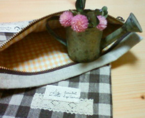 先日届いたSnowwingさんの『Hug Bag』と『Zip Pouth』を作ってみましたタグや、持ち手のちょこっとレース。内布は、小花柄でかわいくしてみました。ポーチは明日誕生日の母へのプレゼントに旅行が趣味で、今度は香港に行くそう色々入れてもらえそうかなyukiさんのとこの、かわいいモノグラムをつけて