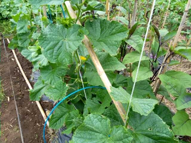 こんにちは。今日は曇りです。今日は○キュウリ○です。△キュウリ△今年は、寒冷紗をかけていたので芽欠きがうまくいきませんでした。それで子蔓がいっぱいになって今は、混み過ぎの状態になっています。徐々に葉を欠いて行き風通しが良い状態まで持っていきます。相変わらずウリハムシに葉をかじられています。朝早く畑へ行ってウリハムシを捕殺はしているのですが繁殖のスピードの方が上みたいです。△ナス△キュウリの隣のナスです。今年も千両ナスと長ナスです。今年は変形な茎になっています。通常のようなノーマルな枝ぶりになっていませんね。でも花は咲いています。雌しべが雄しべより引っ込んでいるので栄養が足りないみたいです。ちょっとづつ化成肥料を追肥しています。△マサキ△良く垣根などで使われるマサキです。私は花が咲いているのを初めて見ました。とても珍しいなと思いました。今日は、我が家のブドウの1回目ジベレリン処理をしました。デラウエアなので処理濃度が100ppmと巨峰などに比べ4倍濃度が高いです。ジベレリン1袋で500ccしか溶液を作れないので最後はで処理きないものもでてきました。仕方ないですね今日の日本株はPF509千円(前日比+1千円)でした今日の取引はありませんでした。今日の予報は最高気温22℃、最低気温16℃です。今日は寒かったですね今日もつたないブログに来ていただきありがとうございました。「花、ガーデニング」「菜園」部門に登録しています。ガーデニング初心者ランキング家庭菜園ランキングにほんブログ村↑一日1回クリックして戴けると嬉しいです。花キュウリナスマサキ