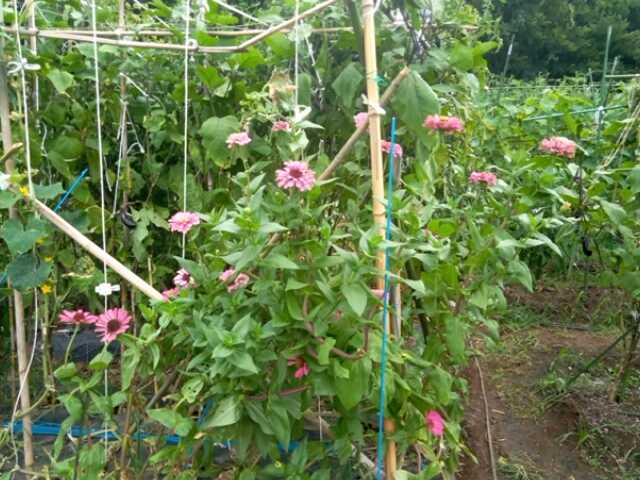 こんにちは。今日は曇り時々晴れです。今日は○ヒャクニチソウ○です。△ヒャクニチソウ△貸農園のコンパニオンプランツとして植えたヒャクニチソウが大木君っています。もうキュウリは葉が枯れあがっており必要ないのですが1m以上になって咲いています。△ヒャクニチソウ△こちらはまた別な品種のヒャクニチソウです。株の下にはこぼれだ根として小さな苗が出てきています。△丸オクラ△丸オクラが1.5mくらい大きくなっています。黄色い花が咲いています。1本から分岐してたくさんの枝を出しています。3~4粒蒔いて1本は間引きましたがそのまま育てると密植栽培の方が柔らかな実が採れるということでそのままにしたら結局1本しか残りませんでした。今は実を1個収穫したらその下の葉を1枚切り取るような管理作業をしています。△大葉ニラ△一番手前に植えているニラです。だいぶ本数も増えてきています。このニラもトマトやナスのコンパニオンプランッツとして根元に数本まとめて言えています。その植え残りを植えています。光がさんさんと当たるのでしっかり成長しもうトウが立って蕾が出始めました。写真はトウを摘んだ後です。トウが立つと固くなるので収穫は終わりですね。しっかりトウを切り取れば株の消耗が少なく無くなります。今日の日本株はPF31千円(前日比+2千円)でした今日の取引はありませんでした。今日の予報は最高気温31℃、最低気温25℃です。今日は涼しく感じました今日もつたないブログに来ていただきありがとうございました。「花、ガーデニング」「菜園」部門に登録しています。ガーデニング初心者ランキング家庭菜園ランキングにほんブログ村↑一日1回クリックして戴けると嬉しいです。花ヒャクニチソウオクラニラ