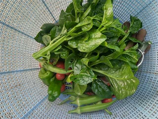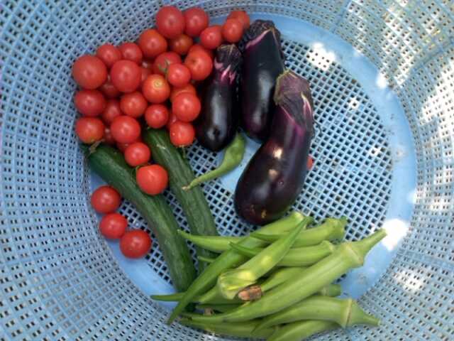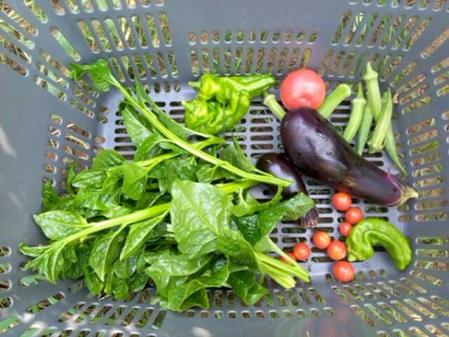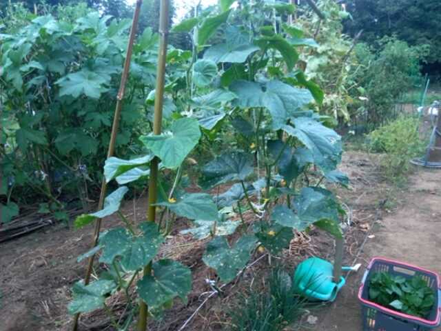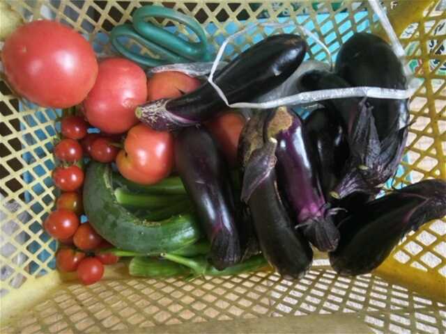 こんにちは。今日は晴れです。今日は○夏野菜の収獲○です。△夏野菜の収獲△貸農園の夏野菜を収穫しました。ナス、トマト、オクラ、ピーマン、ツルムラサキを収穫しました。ナスは採り忘れが根元の方であり、大きなナスになってしましました。種がたっぷり入ったような大きさになっています。キュウリの病気は大きくは広がっていないみたいです。でも親蔓の先端もやられているものもあり脇芽に切り替えざるを得ません。キュウリの実は順調に大きくなっているみたいです。もうすぐ収穫ですよ。今日も畝間に水を張りました。水遣りついでに収穫したような感じです今日の日本株は休みです。今日の予報は最高気温34℃、最低気温27℃です。とても暑かったです。今日もつたないブログに来ていただきありがとうございました。「花、ガーデニング」「菜園」部門に登録しています。ガーデニング初心者ランキング家庭菜園ランキングにほんブログ村↑一日1回クリックして戴けると嬉しいです。家庭菜園夏野菜の収獲
