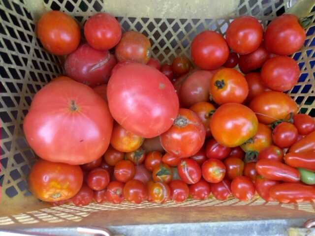 こんにちは。今日は曇り時々雨です。今日は○夏野菜の収獲○です。△夏野菜の収獲△今日も貸農園の夏野菜を収獲しました。トマトにはひび割れが出来ています。雨のせいだと思います。トマト、ミニトマト、ナス、オクラ、ピーマンツルムラサキを収穫しました。いつも通りです。昨日風が強かったので支柱が倒れていないか心配でしたが大丈夫でした。昼過ぎに実家の義姉から畑の小玉スイカがサルに食べられたとの電話がありました。7個全部だそうです。非常に残念でした。結局、人間が食べたのは1個だけ完了です。そのほかにネギも食べられたみたいです。ここしばらく被害がなかったので安心していました。でもしっかり熟したところを食べに来るみたいですね。近いうちに行って確認したいと思います。網の補修もしたいと思っています。猿は引っ張ってスイカの蔓をちぎってしまうので後のうらなりは期待できないだろうなと思っています。今日の日本株は休みです。今日の予報は最高気温28℃、最低気温26℃です。だいぶ過ごしやすくなっています今日もつたないブログに来ていただきありがとうございました。「花、ガーデニング」「菜園」部門に登録しています。ガーデニング初心者ランキング家庭菜園ランキングにほんブログ村↑一日1回クリックして戴けると嬉しいです。家庭菜園夏野菜の収獲トマト