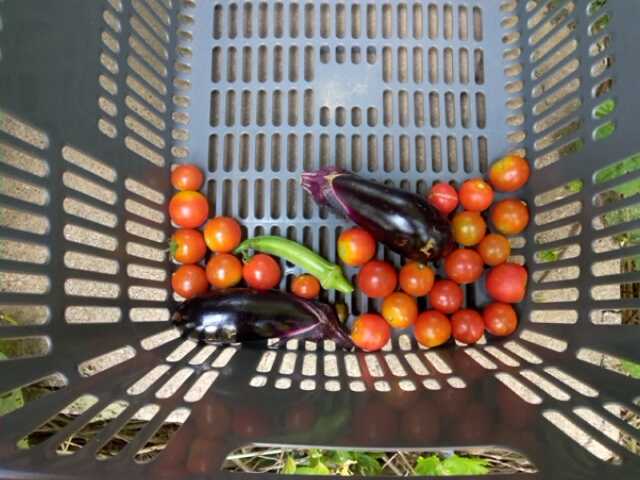 こんにちは。今日は晴れ時々曇りです。今日は○夏野菜の収獲○です。△夏野菜の収獲△今日も夕方に貸農園の収穫に行きました。ナス、ピーマン、オクラ、トマト、ツルムラサキ、キュウリ、ヒラサヤインゲンを収穫しました。いつもの野菜です。それとニンジンの収獲した後地を耕してコカブを蒔きました。ニンジンは2列でしたがコカブは1列です。すぐそばにオクラの根が張っているのでできるだけ端の方を耕しました。蒔いた後は覆土して乾燥防止の枯草を掛けました。最低気温が20℃以下だと発芽適温になるのですが今は暑すぎますね。近くの畑ではもう大根をまいていました。まだ早そうな感じですが暑い時に蒔くことができる品種ができたのかな?今日の日本株は休みです。今日の予報は最高気温32℃、最低気温27℃です。今日も暑いです。今日もつたないブログに来ていただきありがとうございました。「花、ガーデニング」「菜園」部門に登録しています。ガーデニング初心者ランキング家庭菜園ランキングにほんブログ村↑一日1回クリックして戴けると嬉しいです。家庭菜園夏野菜の収獲コカブ 小蕪