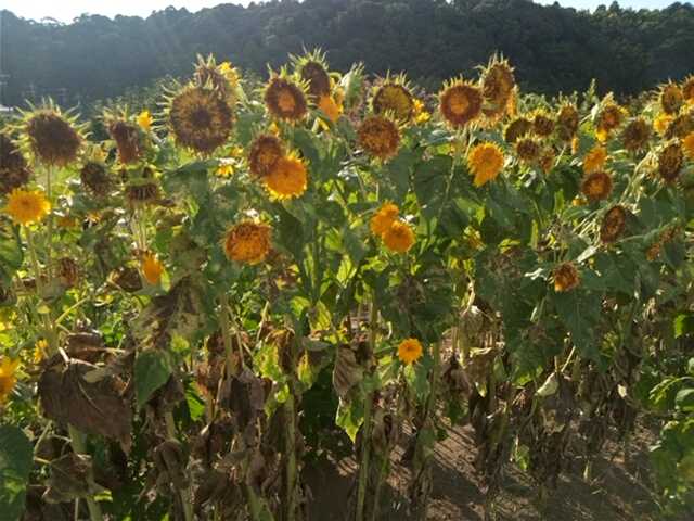 こんにちは。今日は晴れです。今日は○ひまわり○です。△ひまわり△近所の畑に植えてあったひまわりです。もう花は終わりですね。今年は気温が高かったのでひまわりも大変だったと思います。1.5mくらいの樹高の比較的中くらいのひまわりです。△夏野菜の収獲△ナス、キュウリ、トマト、オクラを採りました。トマトは、まだうっすらとピンクになったくらいです。大玉トマトの樹を切り刻んで終わりにしました。切り刻んだ茎や葉は、畝間に敷いて糠をかけて土に戻す予定です。ミニトマトはまだ赤い実が残っているので後にします。コカブは、順調に葉を伸ばしています。昨日植え付けた分結ネギに枯草を寄せて水やりをしました。ネギはもうしっかり立ち上がってきました。今日の日本株はPF558千円(前日比ー6千円)でした今日の取引はありませんでした。今日の予報は最高気温33℃、最低気温25℃です。今日も暑かったです。今日もつたないブログに来ていただきありがとうございました。「花、ガーデニング」「菜園」部門に登録しています。ガーデニング初心者ランキング家庭菜園ランキングにほんブログ村↑一日1回クリックして戴けると嬉しいです。花ヒマワリ夏野菜の収獲