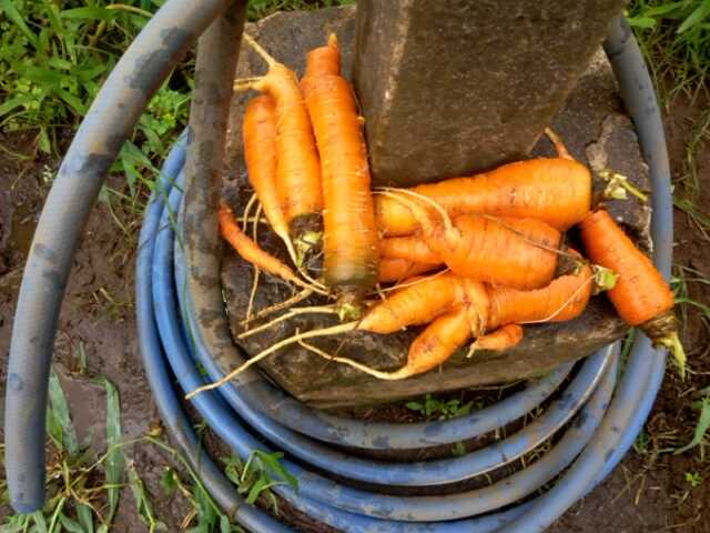 こんにちは。今日は曇りのち雨です。今日は○ニンジン○です。△ニンジン△貸農園のニンジンを収穫しました。豊作です。昔、作ったことがあるのですがとても発芽しなくてしばらく作っていませんでした。今回はニンジンの値段が高くなってきたので種をまいてみたら簡単に育ったのでもう一回蒔いてみようと思っています。△ニンジン△こんな人のような形のニンジンも採れましたよ。まともな形の物もありますよ。△秋キュウリ△先日種をまいた秋キュウリです。暑いのでさすがに成長が早いようです。秋キュウリは地ばいキュウリですが上に吊り下げていきます。狭いところで作るにはこの方法が最適だと思います。△夏野菜の収獲△夏野菜を収穫しました。トマトは白く腐るようなものが出てきました。来年はカルシュウムをかけるようにしたいと思います。まだ子蔓成りのキュウリは、貧弱ですが実が育っています。ナスは強風で吊り下げた紐が切れてしまったので今回補修しました。紐が耐光性でなかったのが劣化して切れました。100均の紐なのでしょうがないかな・・・。今日の日本株はPF551千円(前日比-83千円)でした今日の取引はVコマース売却で-1千円でした。今日の予報は最高気温31℃、最低気温27℃です。今日も涼しかったです。今日もつたないブログに来ていただきありがとうございました。「花、ガーデニング」「菜園」部門に登録しています。ガーデニング初心者ランキング家庭菜園ランキングにほんブログ村↑一日1回クリックして戴けると嬉しいです。家庭菜園ニンジン地ばいキュウリ夏野菜の収獲