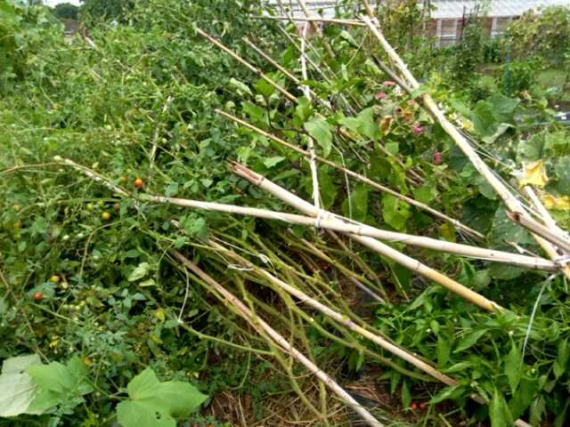 こんにちは。今日は曇り時々晴れのち雷雨です。今日は○台風の被害○です。△貸農園の様子△きゅうり、ナス、トマトの2畝分が倒れました。この倒れた支柱を直すために川脇の竹を20本ほど切り出して直しました。とにかうく暑くて大変でした。こんなはずではなかったのですが台風の北風が思った以上に強かったみたいですちなみにいつもは西風に強いような東西で畝建てにしています。△台風の被害△丸オクラの木も倒れてきたトマトに押されて倒れています。竹の小さな支柱を使い持ち上げました。△キュウリ△秋キュウリとして蒔いた地ばいキュウリです。1本立てに間引いたら1本が大きくなってきました。下は枯草を引いています。本葉2~3枚というところです。手前はコンパニオンプランツのニラです。△夏野菜の収獲△大玉トマト6個(うち1個は青いまま)、ミニトマト6個、キュウリ1本、ピーマン2個、ツルムラサキ5本、オクラ1本、インゲン豆3本です。青いトマトは、支柱を交換したときに落ちてしまったものです。小さいものは皮が固くなっているらしいので大雨で割れています。一応、立て直しましたが3時間もかかってしまいました。暑くてズボンまでびしょぬれで休憩しながら作業しました。今日の日本株は休みです。今日の予報は最高気温33℃、最低気温25℃です。湿度が高く、暑かったです。今日もつたないブログに来ていただきありがとうございました。「花、ガーデニング」「菜園」部門に登録しています。ガーデニング初心者ランキング家庭菜園ランキングにほんブログ村↑一日1回クリックして戴けると嬉しいです。家庭菜園台風の被害秋きゅうり夏野菜の収獲