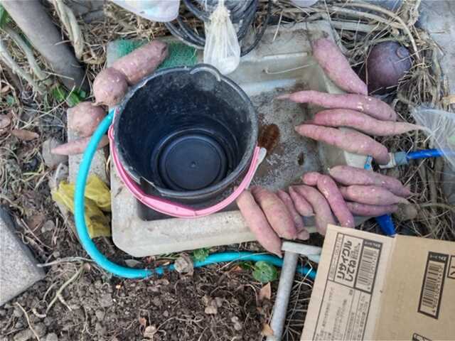 まずは芋を洗って海水位の塩水に1日漬けます。
