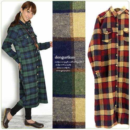 タータンチェックの前ボタンネルシャツワンピース:膝下までのロングタイプ[レディース][長袖][コットン100%][胸ポケット][襟付きシャツワンピ][厚手生地]などをお探しの方に♪◆FASHION\ワンピース・トップス◆★★f100-1