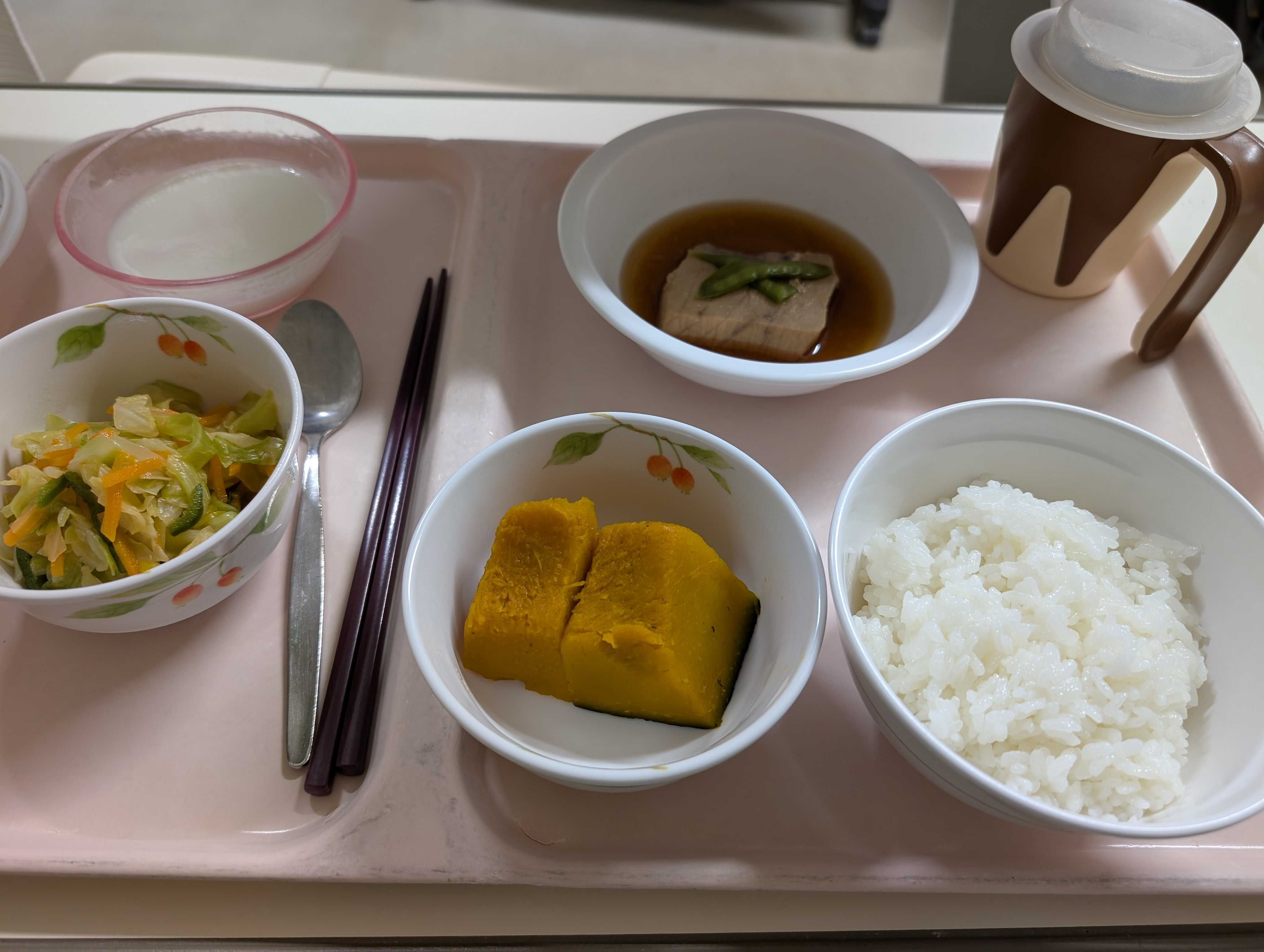 徐々に低糖質に戻そうと米は2/3残し、かぼちゃは栄養価高い皮付近のみ、牛乳かんは一口のみ。