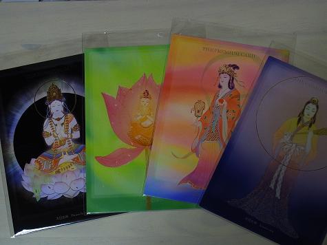 陶彩画家・草場一壽さんの観音力カードですと言ってもセットの観音力オラクルカードではなく数枚だけ買いました。左から大日如来、花心、菊理姫、天照大神さまです。一枚を除いてあとは全部プレミアカードです (お値段もプレミア)おそらくプレミアカードは、セットには(観音オラクル)含まれてないと思いますが?楽天さんではセット購入しかできないのが残念です。※一つひとつのカードの裏にメッセージが付いてあって、それも又いいです。人気のカードにはメッセージが付いてないのもありますが、メッセージは携帯サイトで見れました。特にとくに気に入ったのが、この大調和です。先日買った、この幸せを呼ぶ「観音の絵」で「大調和」という作品が“精神を病んだ患者さんや病院スタッフさんに感銘を与えてくれた”とあったので気になって買ってみました。もう~ほんと!なんと表現すればいいか!吸い込まれるような美しい画で感激しました。このパールと金色の美しいこと購入したお気に入りの観音カードを額に入れて飾ろうかと思っています菊理姫は希望の朝日を手に。太陽の女神 天照大神は稲穂を手に。大日如来は左手親指を中に入れて人差し指を立てた拳をつくり、 立てた人差し指の二節から上を右手の拳で握り込みむ形は「最高の智」を表すそうです。楽天さんにないものをお勧めして、ごめんなさい!※写真は撮ってませんが、新生と藤飛天もスゴく美しくて感動ものでした。今日もアクセスありがとうございました
