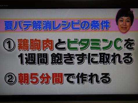 夏バテは脳のサビが原因脳のサビをとる料理を食べれば夏バテに効果大だそうです。イミダペプチドイミダペプチドは自律神経中枢の細胞を錆びさせない効果がある。そのことによって夏バテを防いでくれる。そのイミダペプチドが、ある食品の中に含まれている。~脳の錆を防ぐイミダペプチドが多く含まれる食品~鶏胸肉、牛もも肉、マグロの赤身、カツオなど動物の筋肉に多く含まれているのです。特に鶏胸肉は牛もも肉の5倍近くのイミダペプチドを含んでいる長時間空を飛んでも脳が錆びて筋肉が疲れないようになっているのです。そしてイミダペプチドは一日の活動を開始する前の朝食で摂ると最も効果が期待できる。◇番組で開発したレシピがコレ文部科学省と大阪市立大学の共同研究によれば・・・毎朝、最低50gの鶏胸肉とビタミンCを一週間摂つづければ夏バテを解消に効果あるそうです。-夏バテ解消レシピの条件-イミダペプチドを多く含む鶏胸肉とその効果を高めるビタミンCの両方を一週間、毎日飽きずに摂れるレシピ。しかも、たった5分で出来るというもの。奥薗さん:今回、茹であがった鶏をマリネ液に漬け込んで保存してもらうという方法を取ります。そうするとどんどん味が染み込んで美味しくなるのと、保存性も漬け込んだ方が持つんです。予め、鶏胸肉のマリネを7日分作っておき、それを毎日違う料理にアレンジしていく時短レシピなのです。-鶏胸肉の下ごしらえ-鶏胸肉(約250g×3枚)の皮をとる。鶏肉を7日分に分けたら、さらに厚みが半分になるよう切り開き、表面(裏表)に細かく切り込みを入れる。続いて鶏肉をビニールに入れて塩小さじ1を入れてもみ込み下味をつければ下ごしらえ完了。-鶏を漬けるマリネ液2種類をを作る-わさび醤油だれ 醤油大さじ6、みりん大さじ2梅醤油だれ 梅干し2コ(つぶす)、醤油大さじ2、酢大さじ4、ハチミツ大さじ1/2※それぞれのタレをポリ袋に入れる。続いて鶏胸肉を旨みを逃さないよう、しっとりと蒸し茹でしていきます。水1カップ、酒大さじ2、薄切りにした生姜1かけをいれ沸騰させる。沸騰したら鶏胸肉を並べて1度ひっくり返して蓋をして2分茹でたら・・・奥薗さん:火を止めて余熱で5分です。コレが大事で余熱で火を通す事で、さらにしっとりと柔らかくなるんです。そして5分後・・・鶏肉をそれぞれの漬けダレに入れたら、さらに油大さじ1をそれぞれの漬けダレに入れる。コレで、さらに胸肉をしっとり保存させることができる。わさび醤油ダレには、荒熱が取れたところで、わさび大さじ1を加える。空気をしっかりと抜いて袋を閉じれば、2種類の鶏胸肉のマリオネの完成です。夏バテ解消7日間連続料理開始!1日目 チキンと水菜の和風サラダ梅醤油ダレのマリネとビタミンCは水菜を使ってサラダを作ります。鶏胸肉(梅醤油)・・・100g(薄切りにする)水菜・・・1/2袋(ざく切り)焼き海苔(全形1枚)・・・(手でちぎる)スライスチーズ・・・2枚(手でちぎる)オリーブオイル・・・大さじ1マリネの漬け汁・・・大さじ2鰹節・・・1パック奥薗さん:焼き海苔にはビタミンCが含まれているので、さらに疲労効果期待できます。※ボウルに全部の材料を入れて混ぜれば出来上がり。朝ごはんにコレがつきますと言って水菜のサラダとスイカが食卓にありました。2日目 チキンとカイワレの海苔巻き梅醤油ダレと貝割れを使って海苔巻きを作ります。焼き海苔(全形1枚)・・・2枚ごはん・・・茶碗2杯分酢・・・適宜貝割れ・・・1パック(食べやすい大きさに切る)きゅうり・・・1/2本(食べやすい大きさに切る)鶏胸肉(梅醤油)・・・100g(食べやすい大きさに切る)付け合せ醤油・レモン(お好みで)海苔巻きと言えば酢飯が必要!本当に5分でできるの!?巻きやすくするため海苔は半分に切り、そこに普通のごはんを敷いていきます。奥薗さん:ごはんを広げる時に手(指)に酢をつける事で酢飯を作る手間を省略しました。あとはビタミンC豊富な貝割れ、きゅうりと一緒に鶏肉を巻くだけ。レモンを添える。3日目 冷製チキントマトスープ わさび醤油ダレの鶏肉に、ビタミンCはトマトを使ってスープを作ります。きゅうり・・・適宜(1本?)細かく角切りトマト・・・1個(すりおろす)胸肉を蒸し煮した時の茹で汁・・・200ccマリネの漬けダレ・・・大さじ1~2大葉・・・適宜(千切り)みょうが・・・適宜(千切り)鶏胸肉(わさび醤油ダレ)・・・100g(適当な大きさに切る)材料を上から順番にどんどんボウル入れていき混ぜるだけで完成。奥薗さん:トマトをすりおろすことでミキサーを使わず簡単に美味しいスープができます。※きゅうり、大葉、みょうがは結構たっぷり入れてました。4日目 チキンとトマトのチーズトースト鶏肉とチーズをパンにのせたチーズトースト5日目 チキンとキャベツのサンドイッチ鶏肉に塩もみしたキャベツを合わせたサンドイッチ6品目 チキンとモロヘイヤのオムレツ鶏肉にモロヘイヤを加えたオムレツ7品目 チキンとゴーヤのサラダゴーヤと鶏肉をマヨネーズで和えたサラダあ
