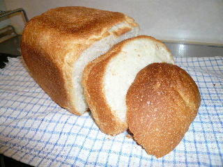 嫁入り道具で持ってきたかったもの・・・。『ホームベーカリー』結婚した当初は、ダンナ様があまりパンを食べないこともあって、欲しかったけど泣く泣く諦めた。作っても食べる人がいない・・・。仕方ないな~と思いつつ、8年という歳月がすぎ・・・。人って口が変わるんだなー。今では、ダンナ様は、朝はパンという生活。ジャックもパンはとっても大好き。今ならパン作ってもいいんじゃない?焼きたてってオイシイし!ダンナ様にお願いして電気やさんへ・・・。もちがつけるやつとか、デニッシュパンやピザ生地ができちゃうやつとか、種類はいろいろ。う~ん・・・一番人気のをお願いします!!おもちもデニッシュも出来ないけどいいよ。普通にパンが焼ければ。お値段もお安くなってるし、今が買いどき!帰って早速説明書をみる。へぇ~材料入れてスイッチ押すだけ!かーんたーん!!よぉーし!明日の朝食は、焼きたてパンだ♪