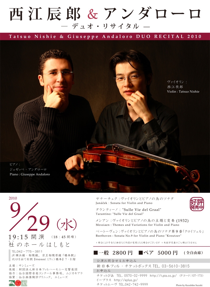 西江辰郎&アンダローロ デュオ・リサイタル 2010 2010年9月29日(水)19:15開演杜のホールはしもと 新宿から京王相模原線、横浜からJR横浜線 橋本駅下車ヴァイオリン/西江辰郎 ピアノ/ジュゼッペ・アンダローロ・ヤナーチェク作曲ヴァイオリンとピアノの為のソナタ・タランティーノ作曲"Sulle Vie del Graal"(日本初演)・メシアン作曲ヴァイオリンとピアノの為の主題と変奏(1932)・ベートーヴェン作曲ヴァイオリンとピアノの為のソナタ第9番『クロイツェル』一般:2,800円 ペア:5,000円(全席自由)主催:サンミューズ後援:財団法人新日本フィルハーモニー交響楽団協力:仙台国際音楽コンクール事務局、ムジカキアラ協賛:仙台画像検診クリニック、エミューズ新日本フィル・チケットボックスTEL 03-5610-3815 FAX 03-5610-3828(平日:10~18時、土:10~15時、日祝休 FAXは24時間)電子チケットぴあTEL: 0570-02-9999 http://t.pia.co.jp/(Pコード:107-173)イープラスhttp://eplus.jp/チケットムーヴTEL: 042-742-9999