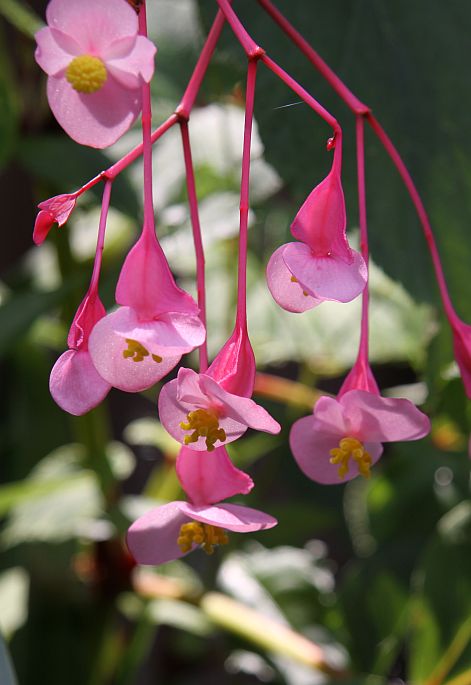 シュウカイドウ~しゅうかいどう科の多年草中国原産。江戸時代に観賞用として長崎に渡来し、その後全国各地に広く植栽され、野生化している。草丈70cm前後、葉は扁心形で左右非対称で互生する。長さが20cm程でシュウ酸が含まれる。花期は8~10月ごろ。茎の頂から花序を伸ばし、2~3cmで淡紅色の美しい花をつける。雌雄同株異花で、雄花は花弁が開き黄色く球状に集まった雄蘂が目立ち、小さな花弁が2枚と、大きな花弁のように見える萼が2枚。雌花には花弁はなく、大きな萼2枚がわずかに開く。名前の由来は、春に咲くハナカイドウ(ばら科の落葉高木)に似て、秋に咲くところから。 手品のような・・・ 埼玉県比企郡ときがわ町・慈光寺で(2010.9.6)