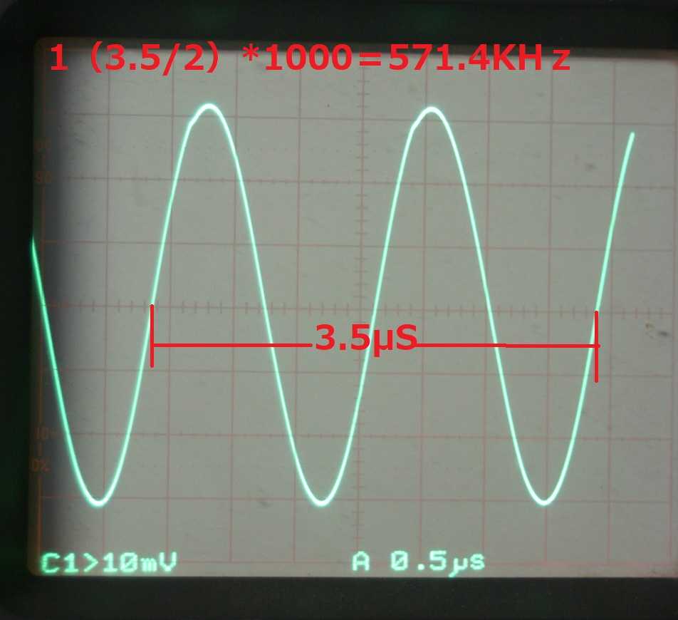 Bレンジ(300KHz-1000KHz)の中央付近(570KHz表示)の波形。多分571KHz位でほぼ合っている?