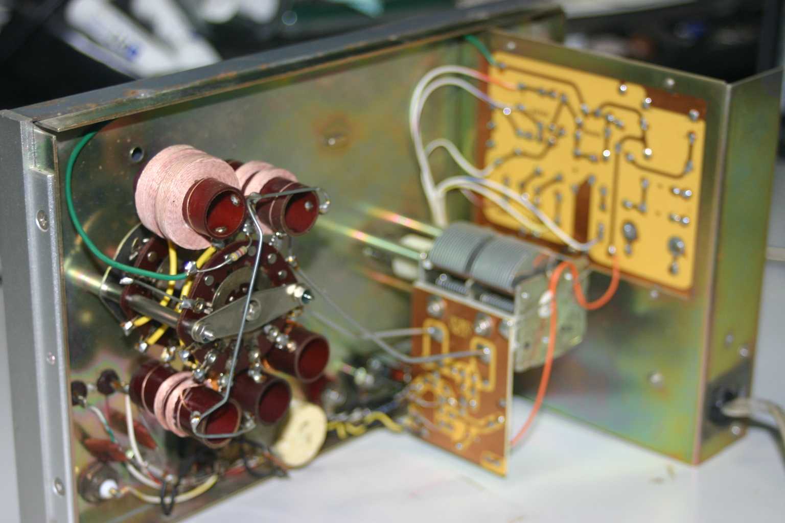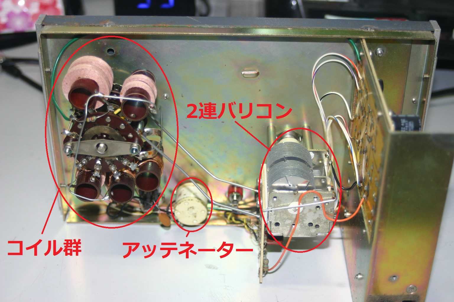 中身はこんな感じでシンプル。5つのコイルと1つの2連バリコンで発振周波数が決まるようです。