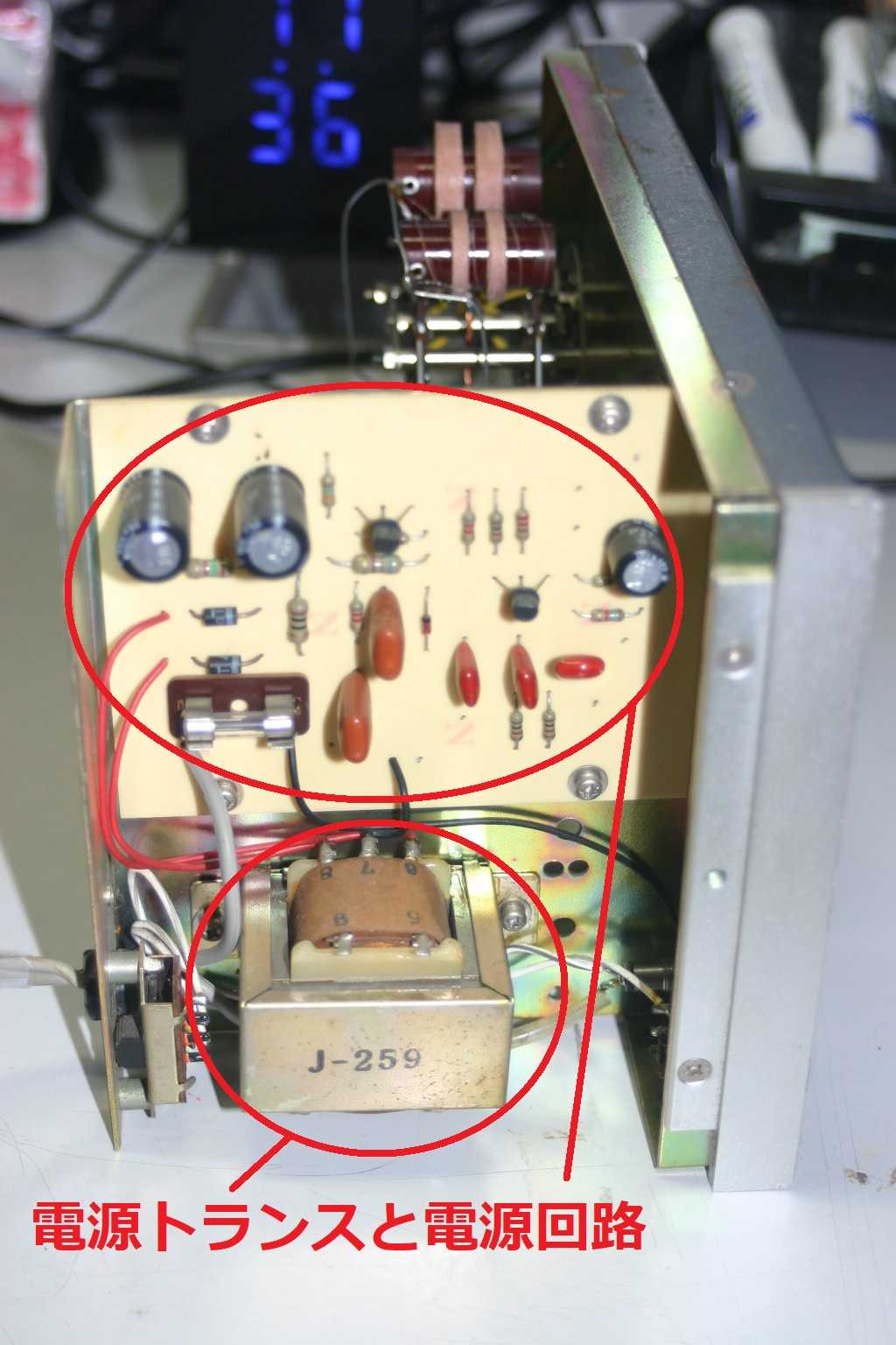 電源トランスと整流回路。一応簡素な安定化電源になっているようです。