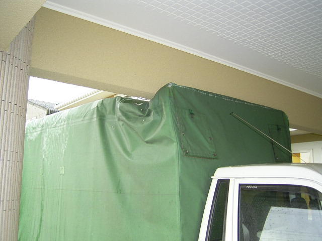 お客様の車が病院の屋根にホロを引っ掛けて動けなくなったとの連絡があり現場に行ってみると、写真のようになってました。車高を下げる為にタイヤの空気を抜いてみましたが無理でした。今度は、前輪をジャッキであげタイヤを外し、地面ギリギリまで下げてやっと屋根をかわったのでそのままバックして抜け出ました。タイヤの空気を抜いたので積載車で工場へ搬送し、ホロを脱着、ホロ骨修正となりました。ちなみに病院は新築したばかりでした。
