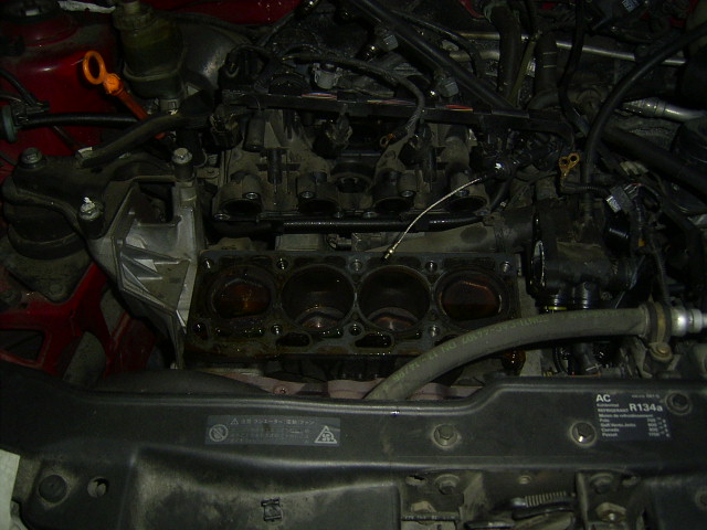 お客様より修理するとの連絡があり、早速ヘッドを降ろしました。ヘッドを降ろす前にタイミングベルトをつけてクランキングして見ましたが圧縮がなかったのでバルブ曲がってるなと思いましたが案の定曲がってます。ディーラーで確認すると、バルブガイドが変形している場合が多いとのことでリビルトのヘッドAssy交換をおすすめするとのことです。リビルトと中古エンジンの見積もりを取ることにしました。